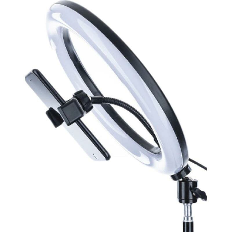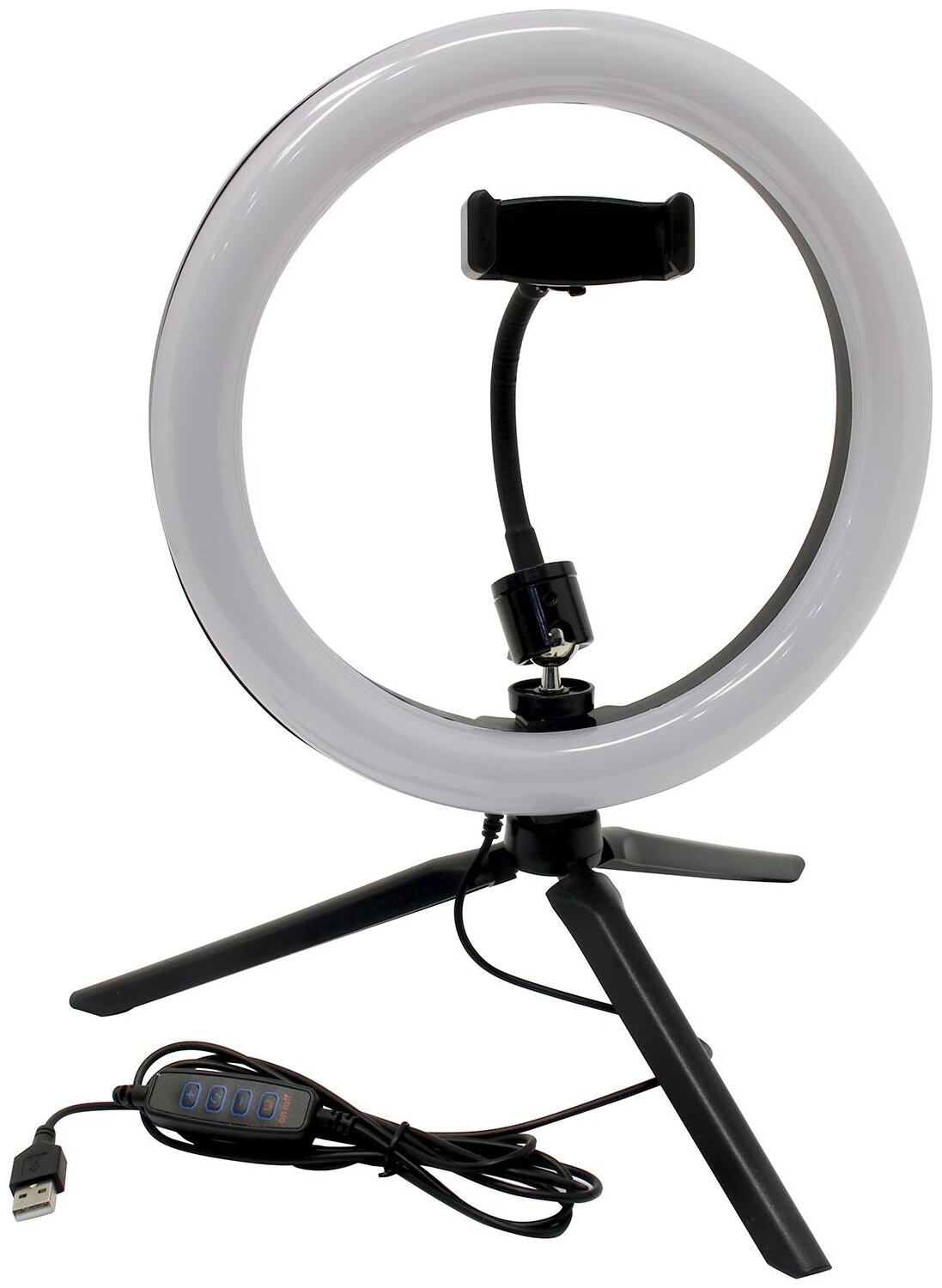 Светильник кольцевой светодиодный на треноге с держателем для смартфона. Предназначен для блогеров, визажистов/стилистов, очень удобен для проведения фото- и видеосъёмки на смартфон. Пульт на проводе питания с кнопками включения и управления яркостью и цветовой температурой. Питание от USB порта.