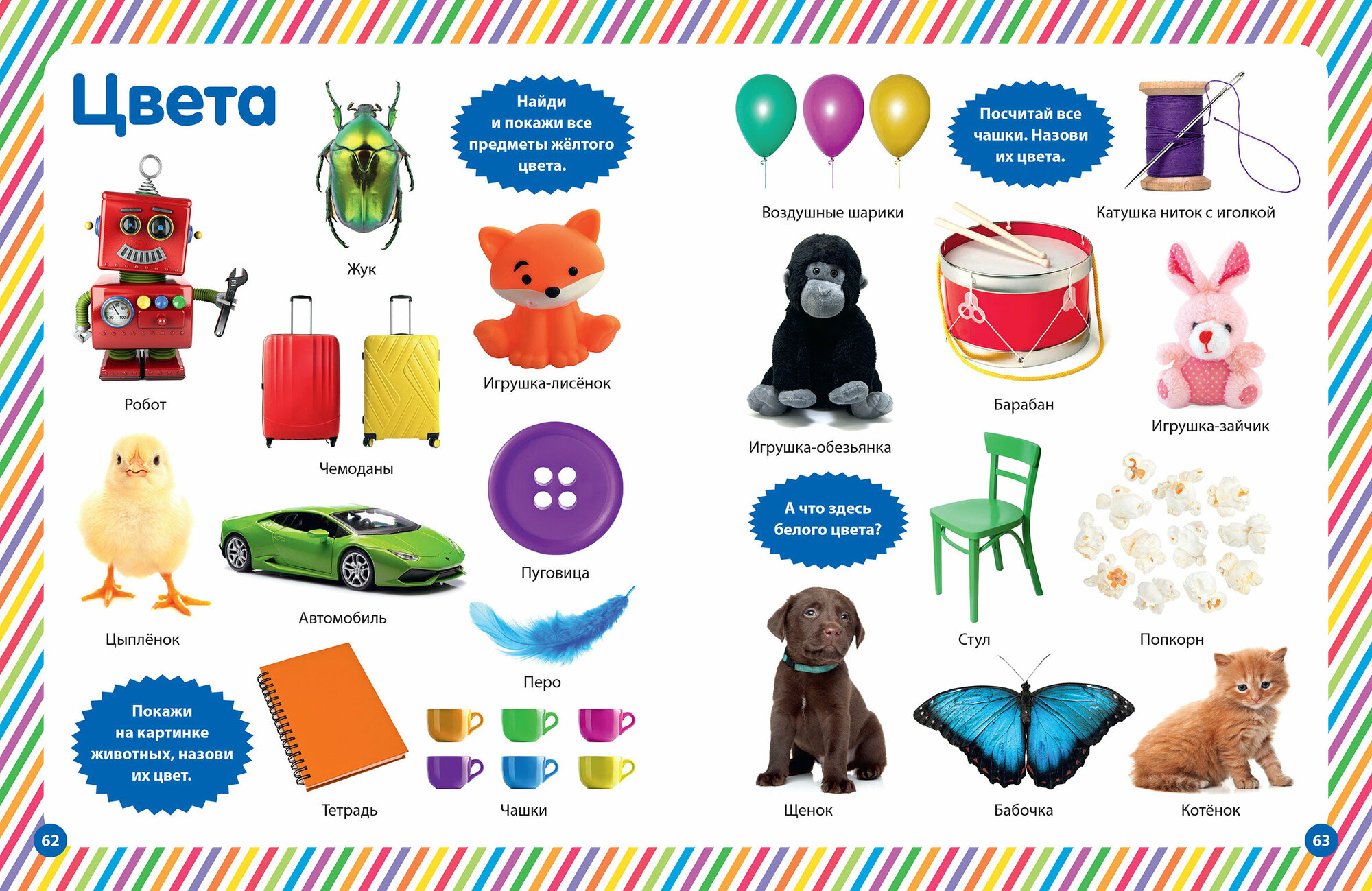 Перед вами фотокнига с реалистичными изображениями самых разных вещей, предметов, животных и растений, которые окружают вашего ребёнка каждый день: осенью и зимой, весной и летом, играет ли он на детской площадке или гуляет с вами в парке. Разглядывая яркие картинки и выполняя вместе с вами несложные задания, малыш будет узнавать и научится называть разные предметы, различать цвета и формы и потренируется в простом счёте.