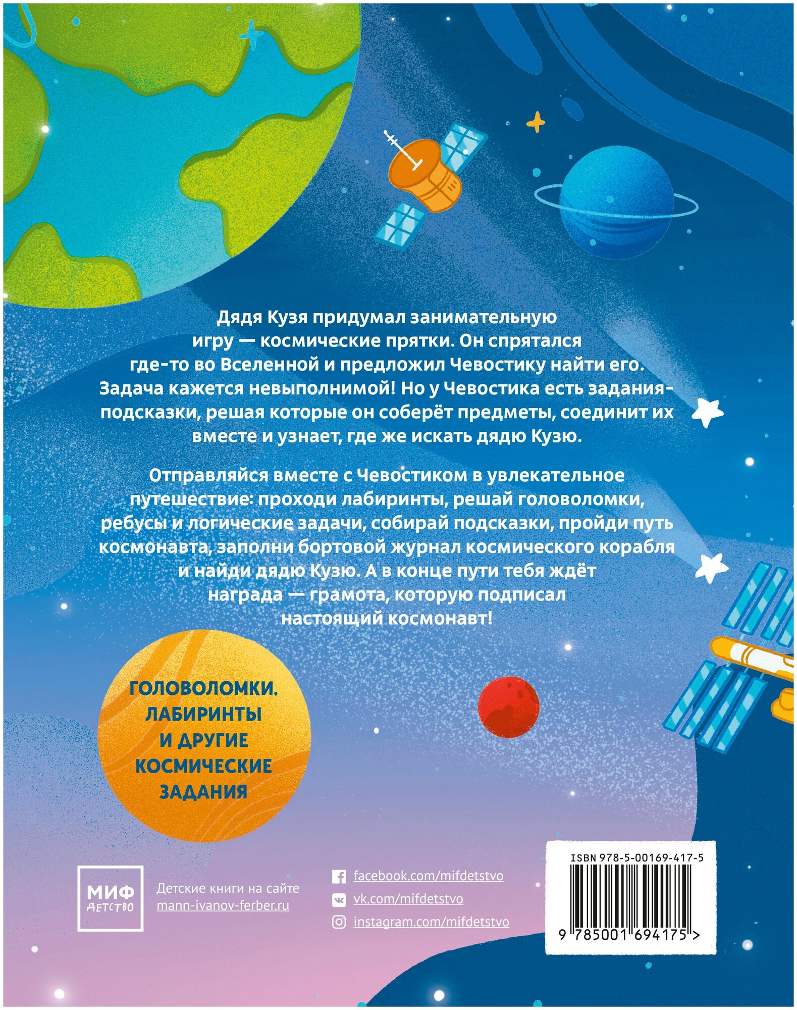 Отправляйтесь вместе с Чевостиком в увлекательное путешествие: проходите лабиринты, решайте головоломки, ребусы и логические задачи, собирайте подсказки, пройдите путь космонавта и найдите дядю Кузю. В конце книги вас ждет бортовой журнал космического корабля и грамота за заслуги и выдержку, проявленную в ходе выполнения космического задания, подписанная настоящим летчиком-космонавтом - Геннадием Ивановичем Падалкой.