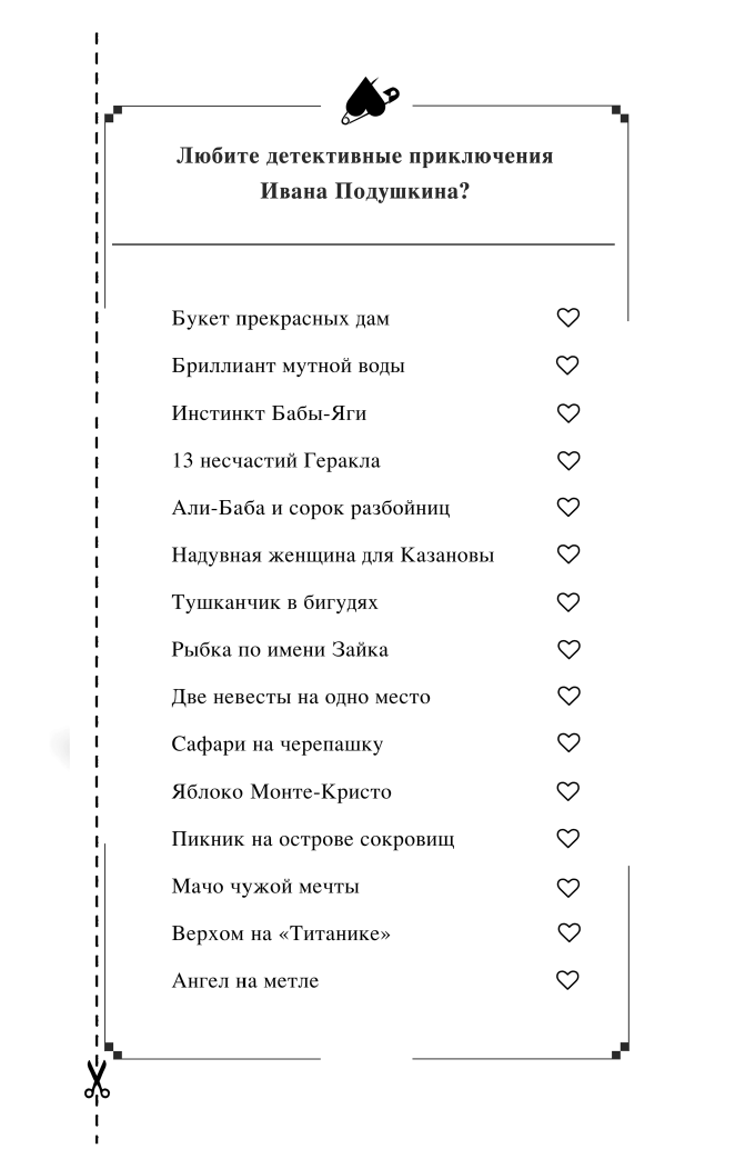 Увидела новый детектив от Дарьи Донцовой про Ивана Подушкина с радостью купила,т.к.очень нравится автор.С удовольствием начала читать.Как всегда увлекательный,лёгкий,интересный сюжет,который всегда поднимает настроение.И я с нетерпением жду продолжения историй о частном детективе Иване Павловиче Подушкине и его приключениях.