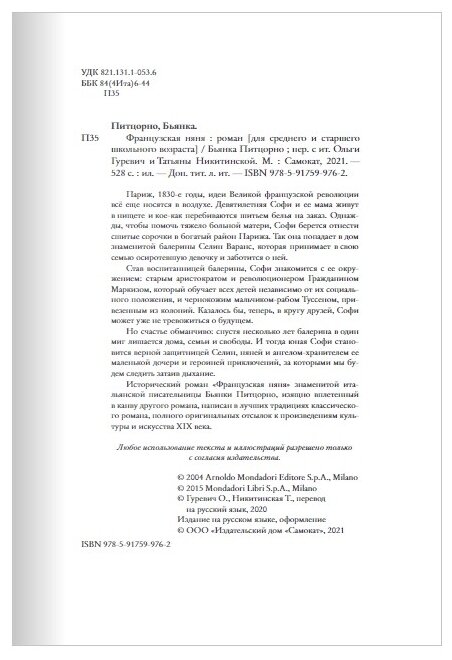 Исторический роман «Французская няня» знаменитой итальянской писательницы Бьянки Питцорно, изящно вплетенный в канву другого романа, написан в лучших традициях классического романа, полного оригинальных отсылок к произведениям культуры и искусства XIX века.