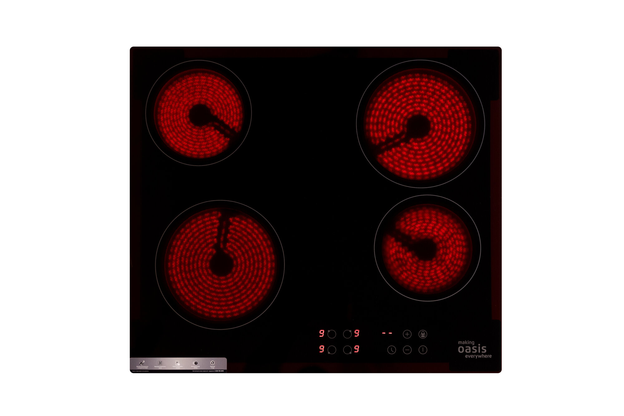 Встраиваемая независимая электрическая варочная поверхность Oasis имеет четыре конфорки разных размеров. На ней можно готовить одновременно несколько блюд.