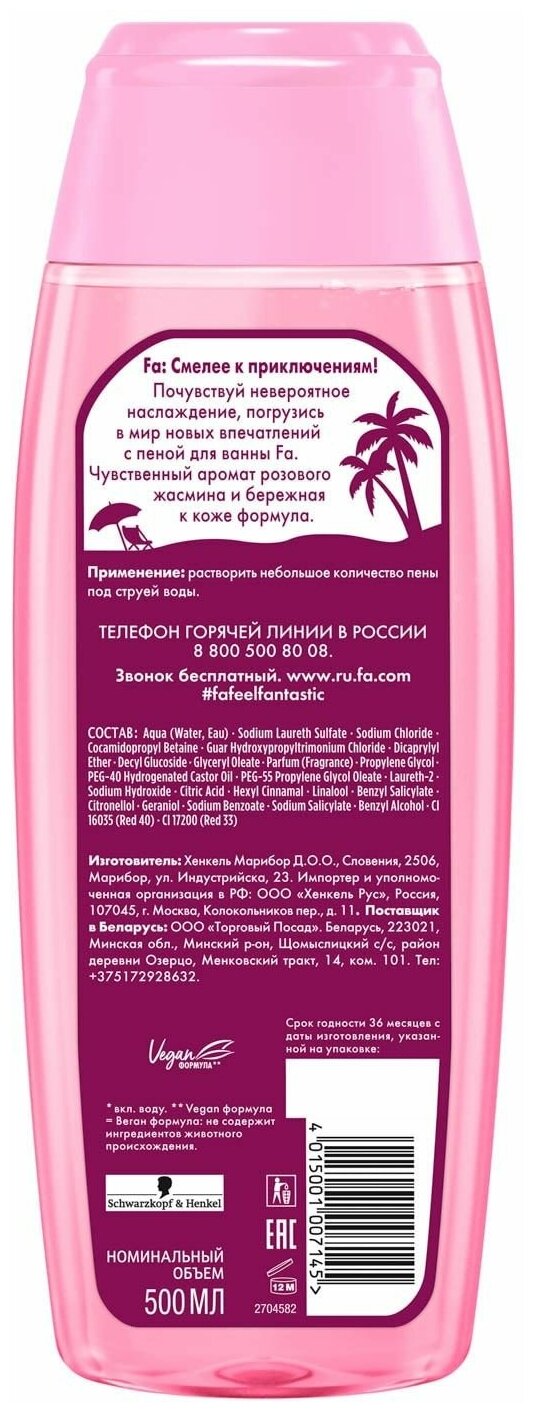 Превратите ванную в мир наслаждения с пеной для ванн Fa "Розовый Жасмин". Ухаживающая легкая пена с микромаслами не сушит кожу и обеспечивает ощутимый уход. Формула не оставляет жирных следов. Нежная пена ласкает вашу кожу, придавая ей ощущение шелковистости. Пребразите свое тело и чувства со свежим ароматом розового жасмина. pH-нейтральна. Хорошая переносимость кожей подтверждена дерматологами.