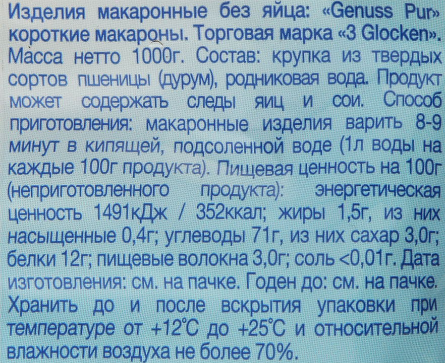 Макаронные изделия 3 Glocken GP Röhrchen Короткие.Состав: Крупка из твердых сортов пшеницы (дурум), родниковая вода.