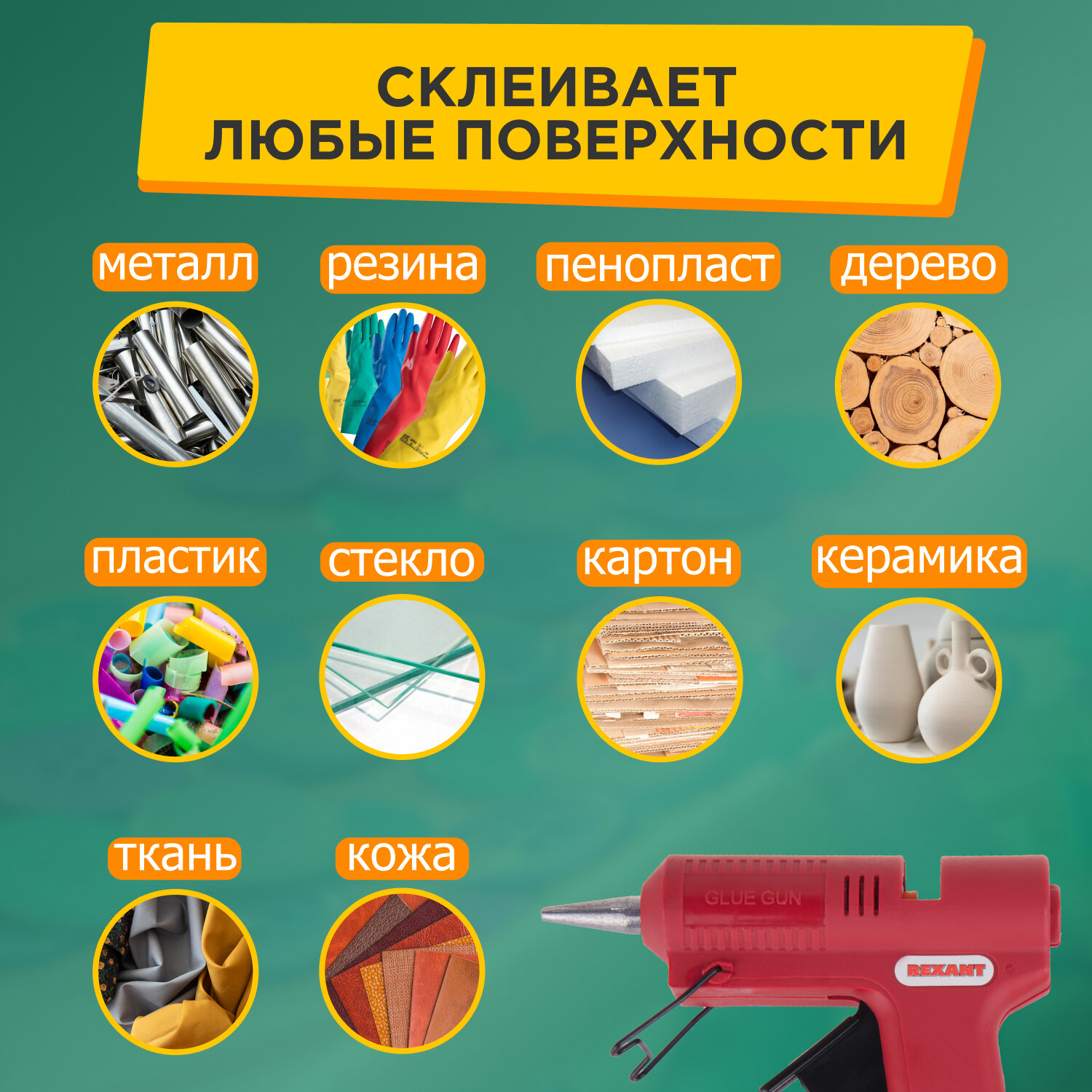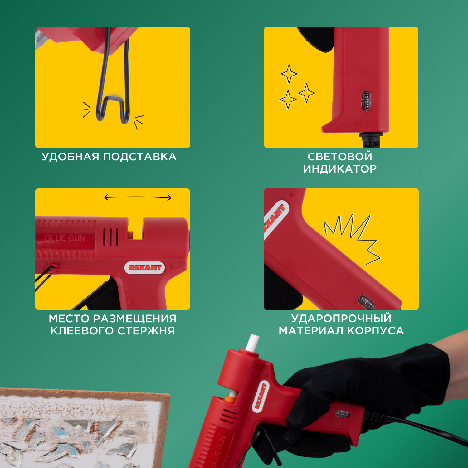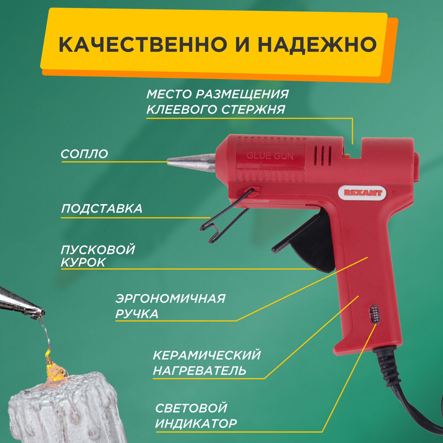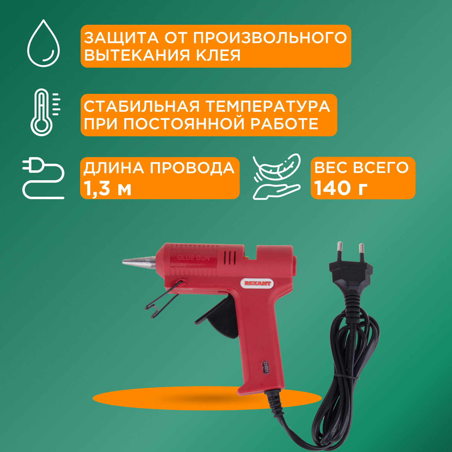 Часто на производстве, в процессе стройки или же для какого-либо мелкого ремонта требуется простой и неприхотливый инструмент, обладающий прочностью и долговечностью, необходимой для любой качественной работы. В связи с такими запросами Вам будет полезен клеевой пистолет от Rexant модели . Пистолет обладает небольшим весом, достаточным для комфортной переноски и долгого времени работы с инструментом без усталости рук, также такой компактный прибор может похвастаться отличной мощностью в 15 ватт.