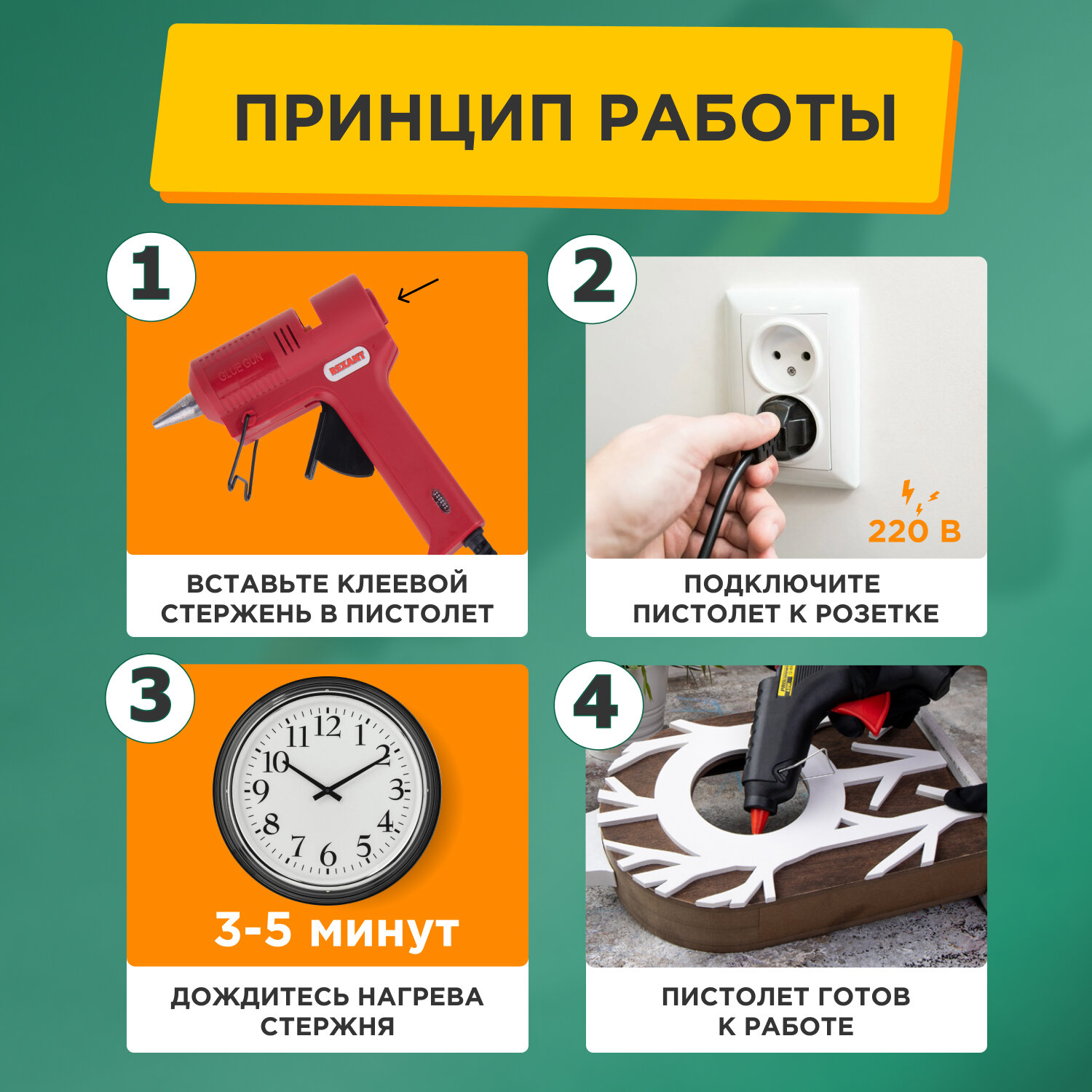 Клеевой пистолет - предназначен для склеивания всевозможных деталей с помощью расплавленной клеевой массы. Данная модель пистолета клеевого оснащена клапаном, который препятствует самопроизвольному вытеканию клея, а также отличается ударопрочным пластмассовым корпусом со скобой для надежной установки в нерабочем положении и наличием LED-индикатора работы пистолета.