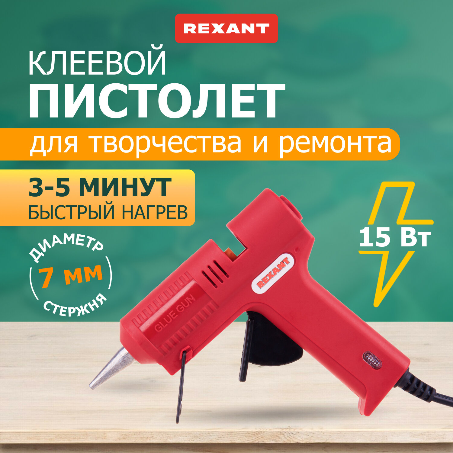 Пистолет клеевой 15Вт Ø7мм Малый REXANT предназначен для прочной фиксации поверхностей с помощью расплавленной клеевой массы. Заправляется он специальным клеевым стержнем диаметром 7 мм. Корпус клеевого пистолета изготовлен из ударопрочной пластмассы и имеет скобу для надежной установки в нерабочем положении. Принцип работы: клеевой стержень плавится в металлической камере с помощью нагревательного устройства и для точного дозирования при нажатии на курок подаётся из сопла на склеиваемую поверхность.