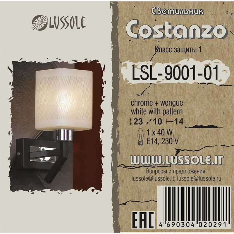 Бра Costanzo - продукт известной компании Lussole (Италия). Имеет максимальную мощность 40 Вт, освещает площадь до 2 кв. м. Отлично подойдет для таких мест, как гостиная, прихожая и коридор, спальня. Впишется в интерьеры следующих стилей: модерн.