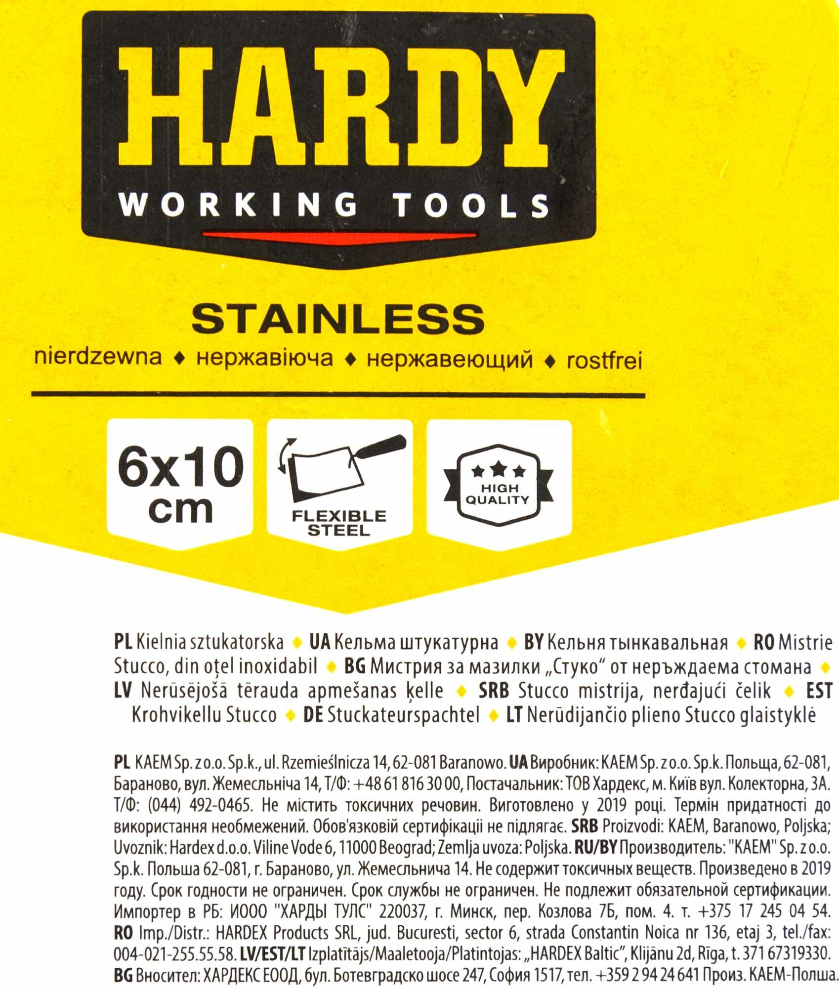 Кельма штукатурная Hardy — ручной строительный инструмент с закругленным краем, предназначенный для нанесения разного рода составов: цементных, шпатлевочных, штукатурных, клеевых, использующихся для отделки поверхностей и кладки. Используется для работ внутри и снаружи помещений. С помощью кельмы легко выровнять раствор, заполнить вертикальные и горизонтальные швы. Модель отличается компактными размерами и небольшим весом, что значительно упрощает работу с ней. Особенности: - оснащена удобной ручкой;