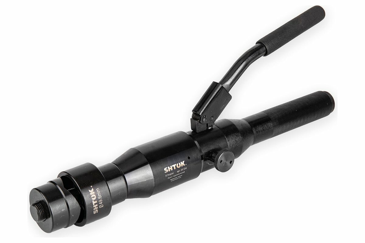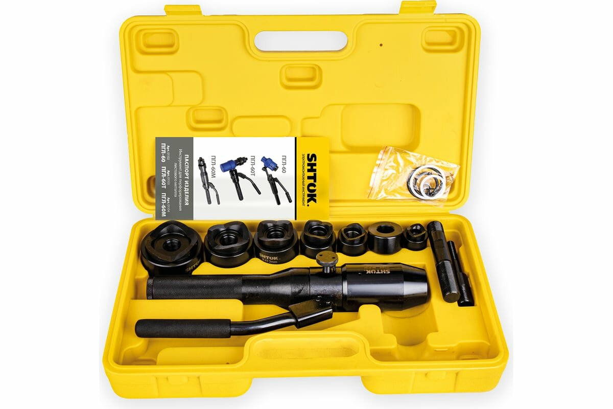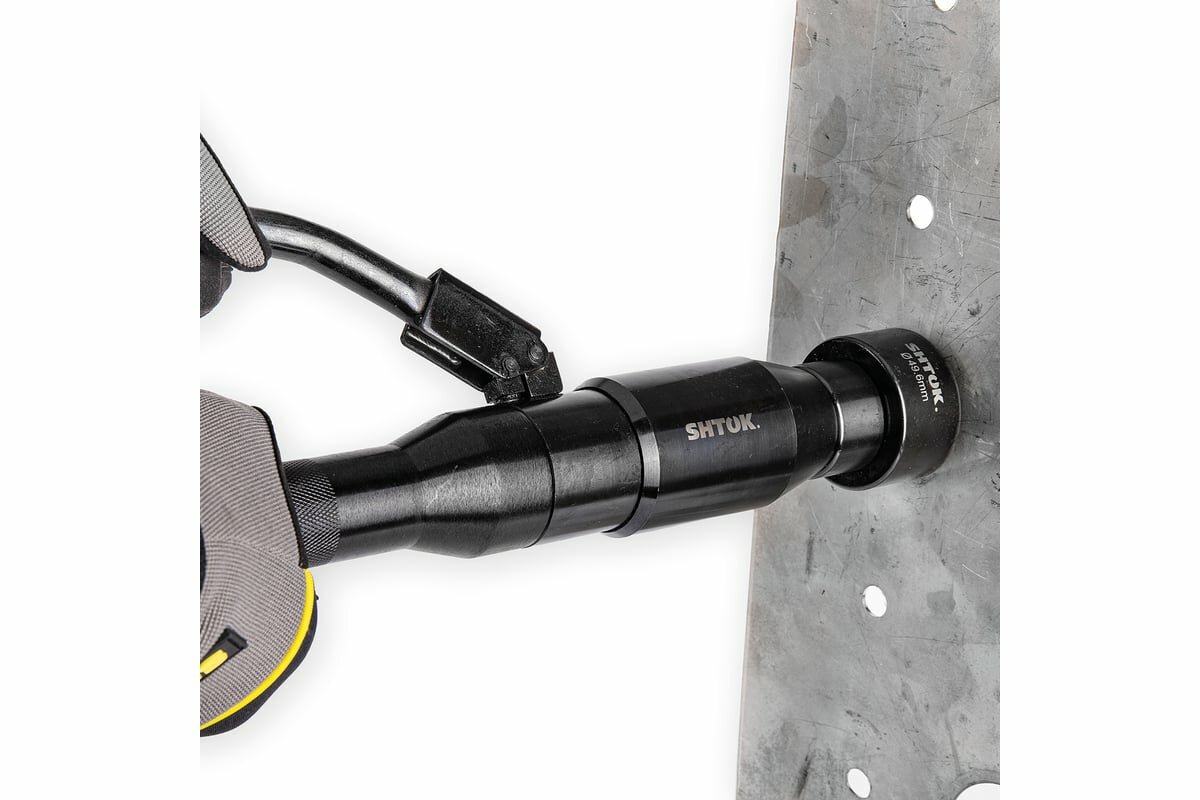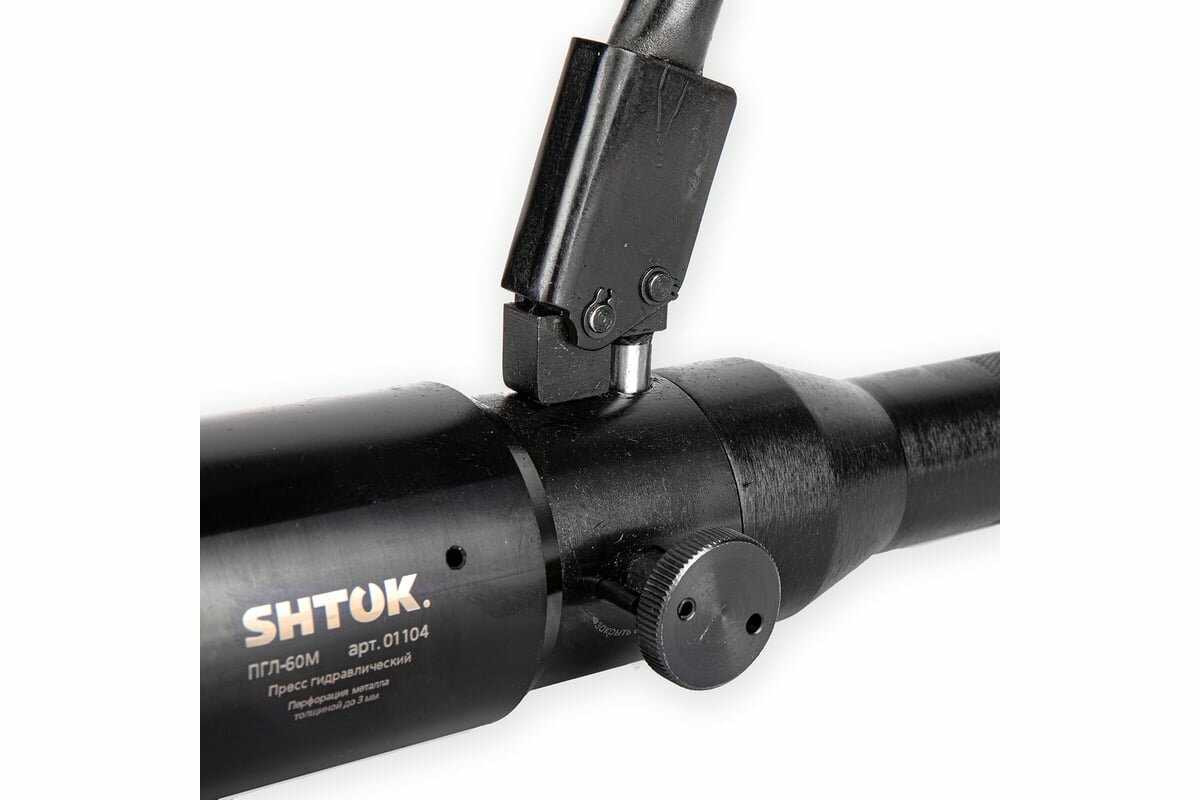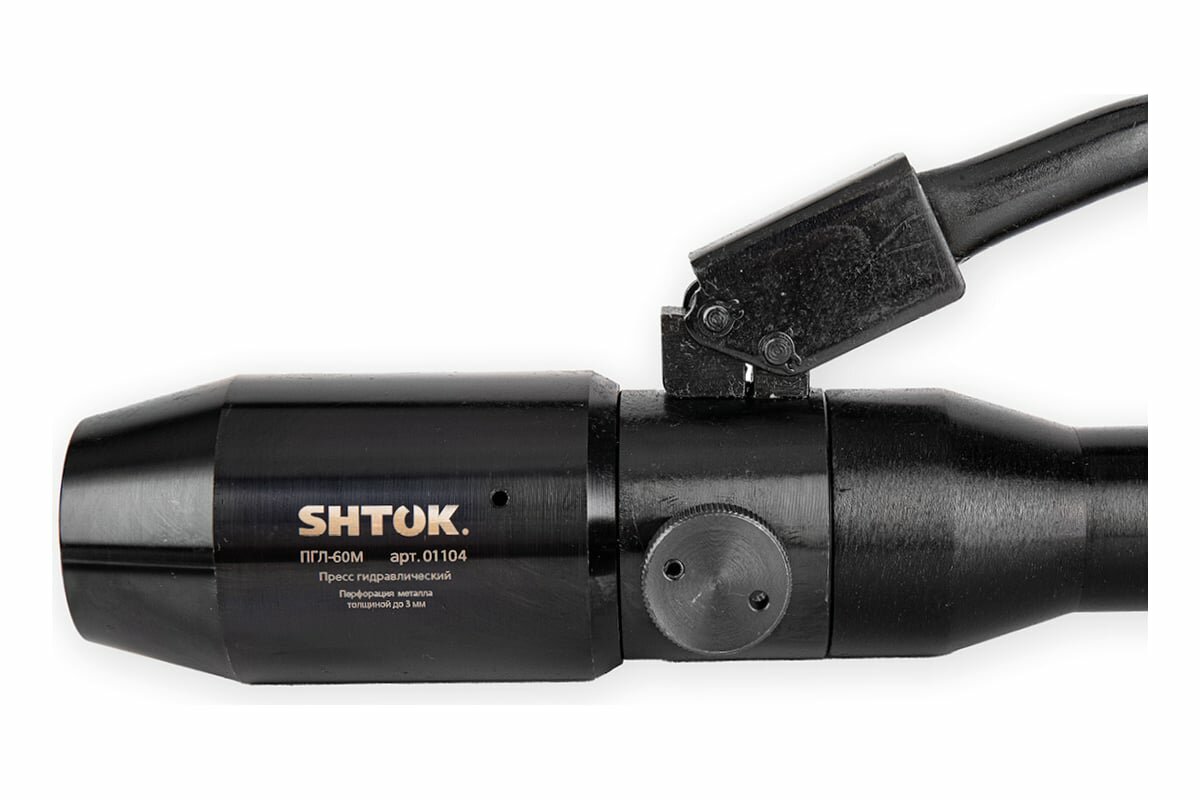 Ручной гидравлический перфоратор для листового металла SHTOK 01104 используется на производственных предприятиях, на станциях технического обслуживания автомобилей. Благодаря возможности работать с различными насадками, инструмент может проделывать отверстия разного вида. Предназначен для работы с листовым металлом толщиной до 3.5 мм.