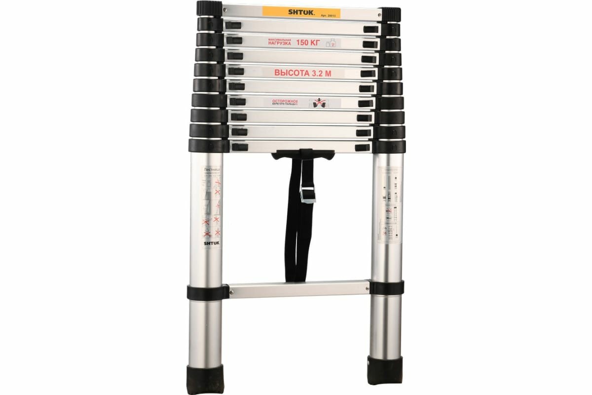 | Прочие особенности и свойства | Телескопическая лестница SHTOK 3.2м 20013 выдерживает нагрузку до 150 кг за счет конструкции, выполненной из дюралюминия и первичного пластика. На стенде испытываемая лестница выдерживает 10 000 циклов на раскрытие-закрытие. |