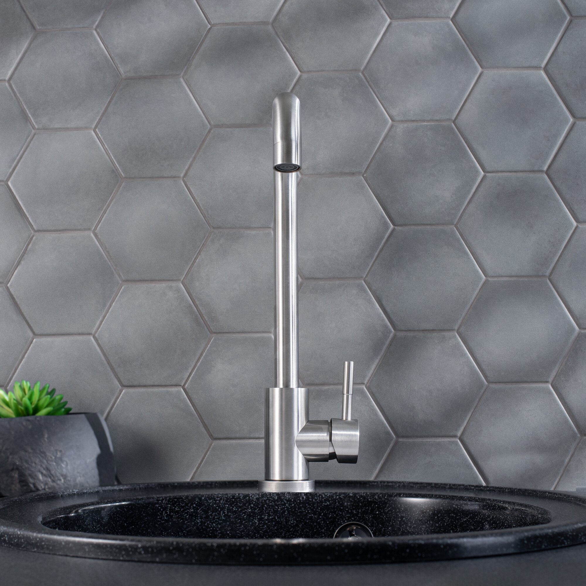 Оригинальный однорычажный смеситель для кухни из нержавеющей стали с высоким изливом прекрасно подойдет для мойки любого размера.
