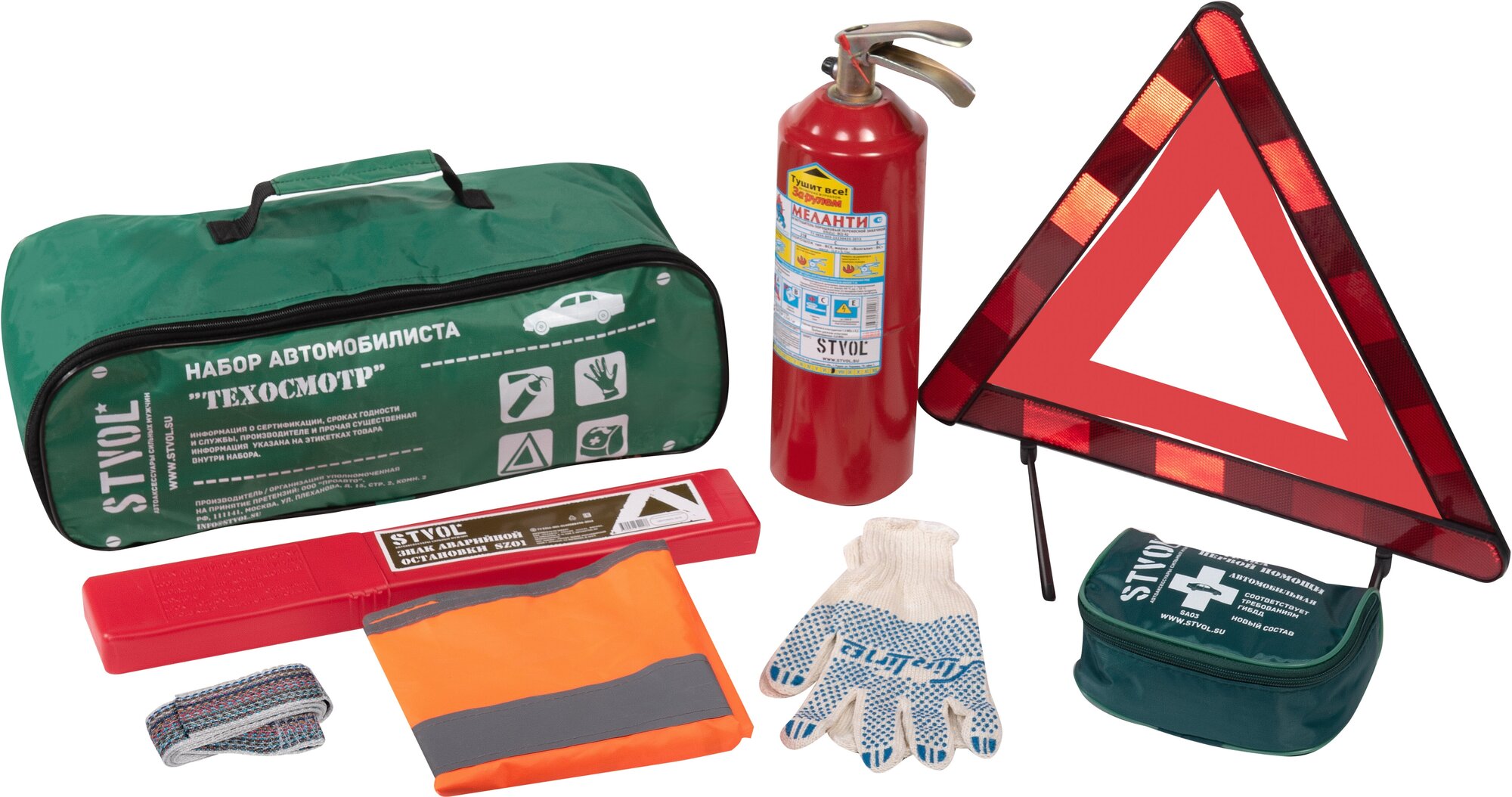 Набор автомобилиста "Техосмотр-4"(Знак+Аптечка+Огнет.ОП2+Жилет светоотр.+Трос + Перчатки), STVOL.