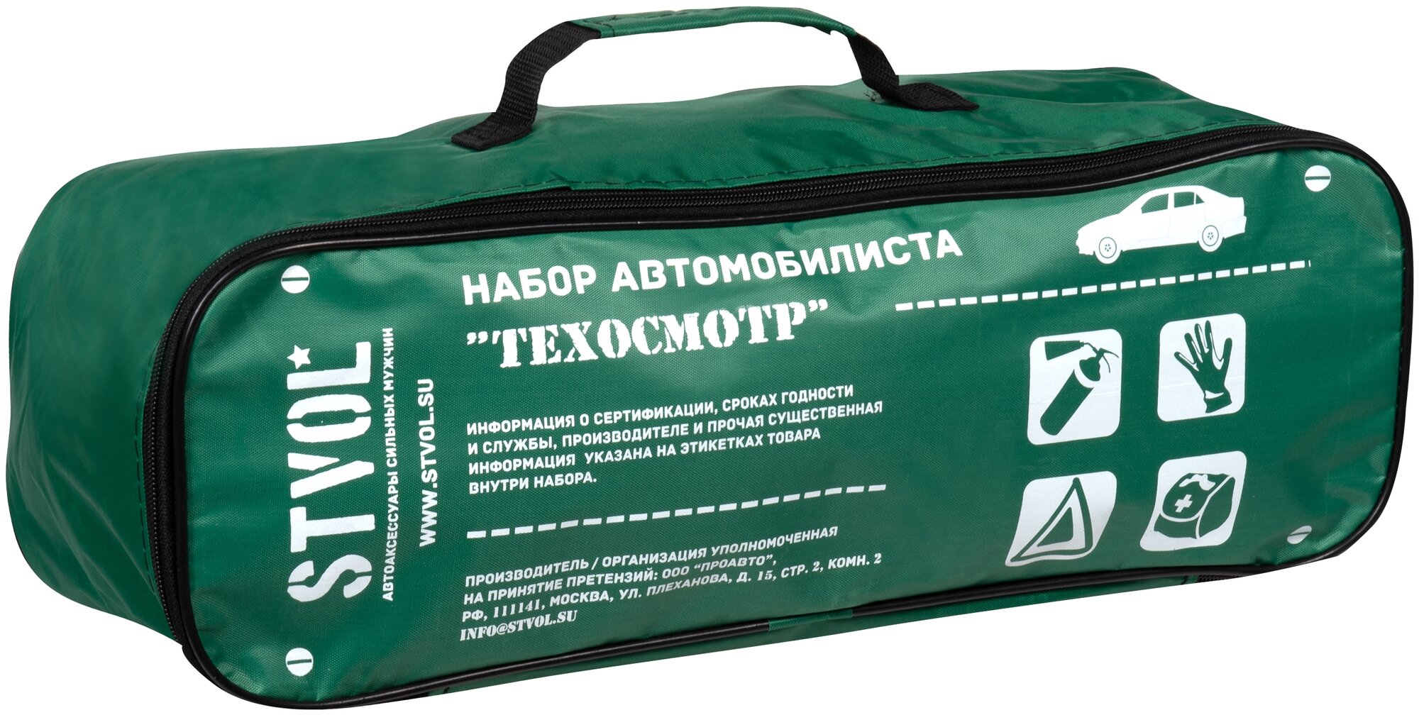 | Состав набора | аптечка; знак аварийной остановки; огнетушитель; перчатки; светоотражающий жилет; трос |