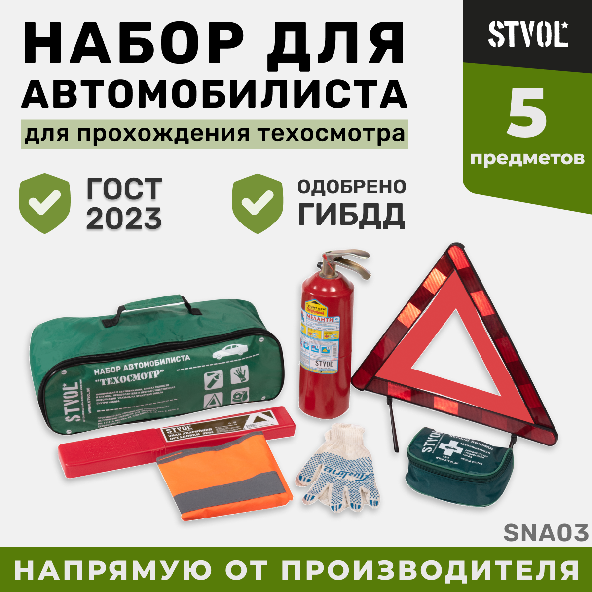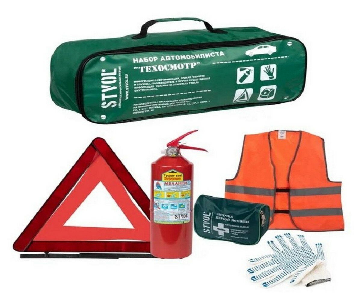 Набор автомобилиста "Техосмотр", ГОСТ(Знак+Аптечка+Огнетуш.ОП2+Жилет светоотражающий+Перчатки),STVOL.