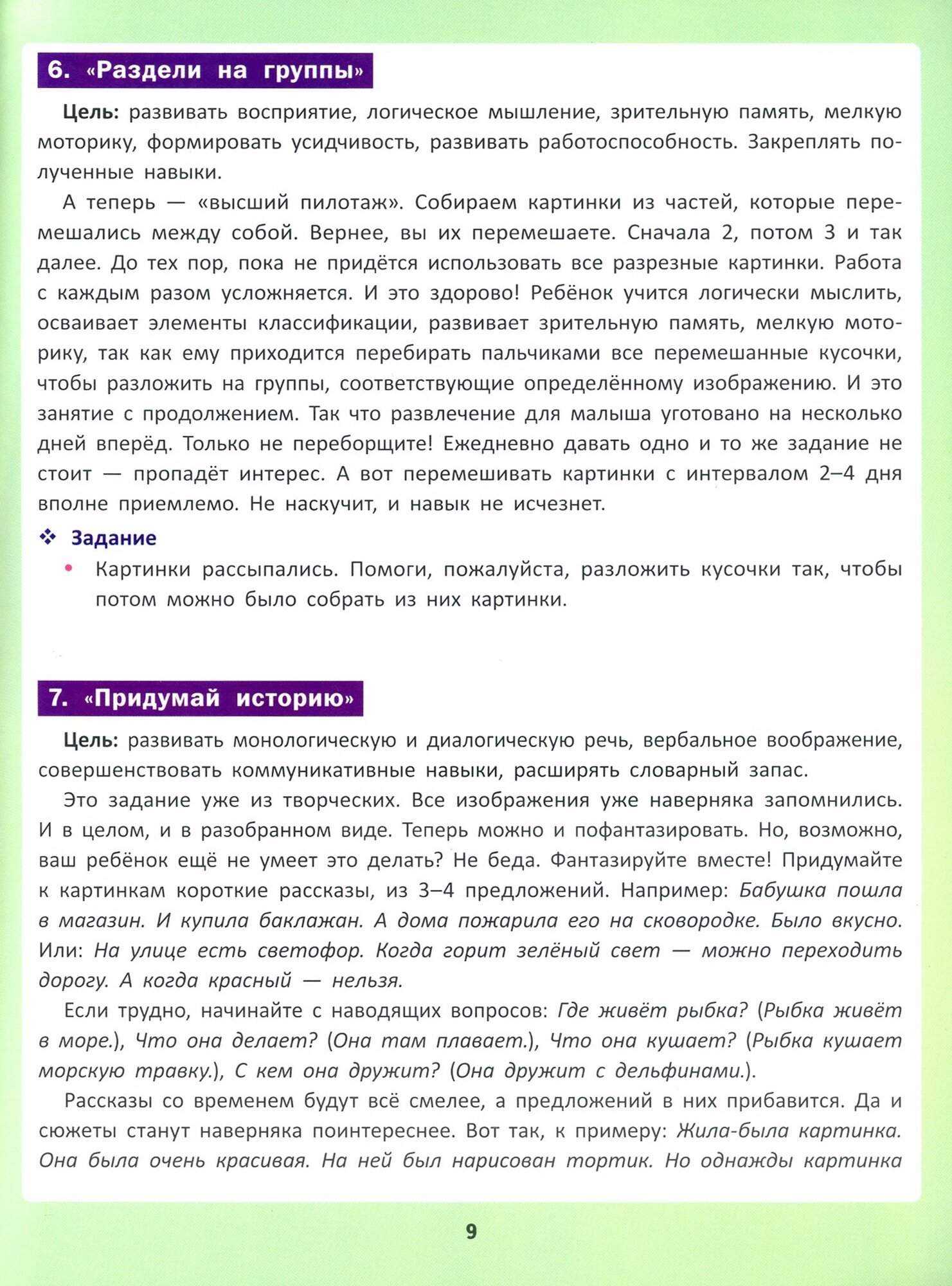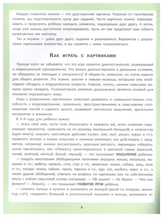 Книга содержит коррекционно-развивающие и диагностические материалы для детей 3-5 лет. Они представлены в виде карточек-картинок, предназначенных для разрезания и сборки, и сопровождаются заданиями, направленными на развитие восприятия и мелкой моторики дошкольников, а также дополнены упражнениями для развития речи, мышления и творческих способностей детей. Задания подобраны по разным уровням сложности в зависимости от возрастных и индивидуальных особенностей ребенка-дошкольника.