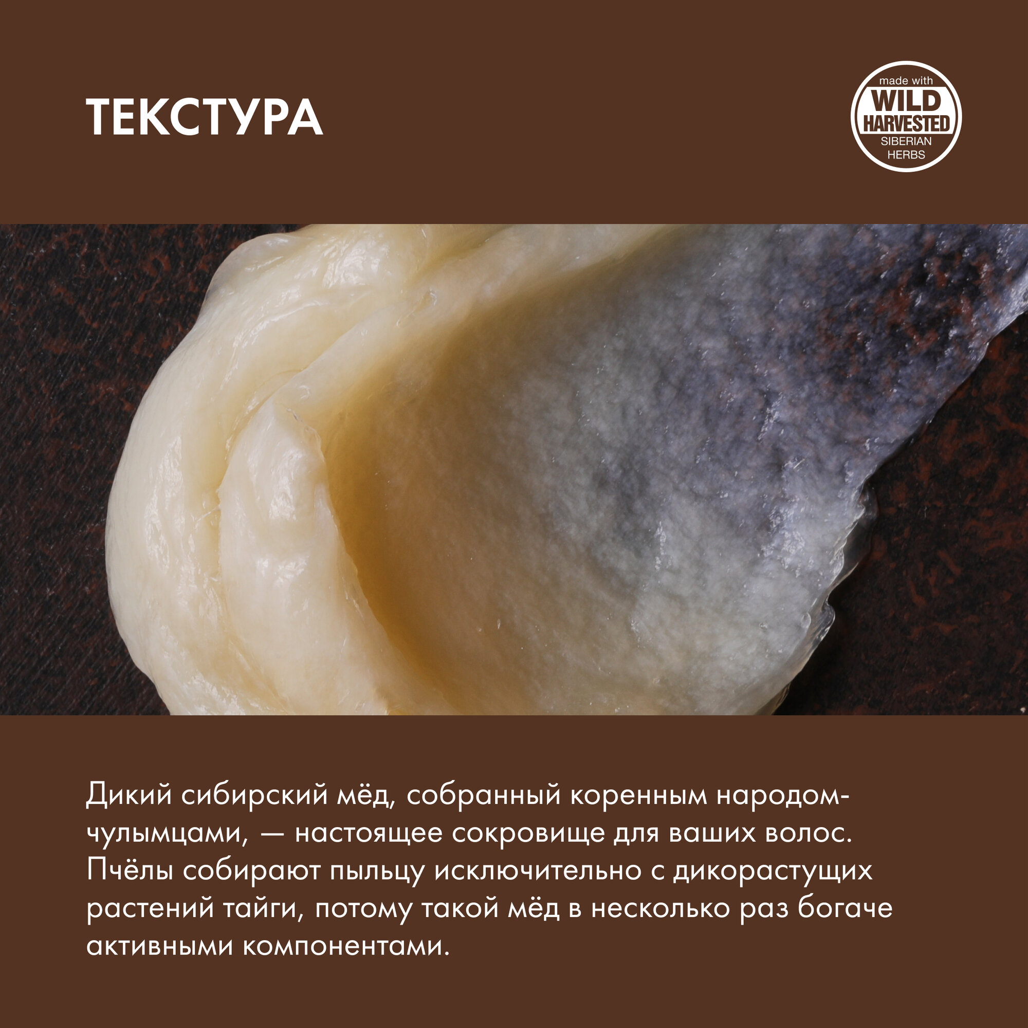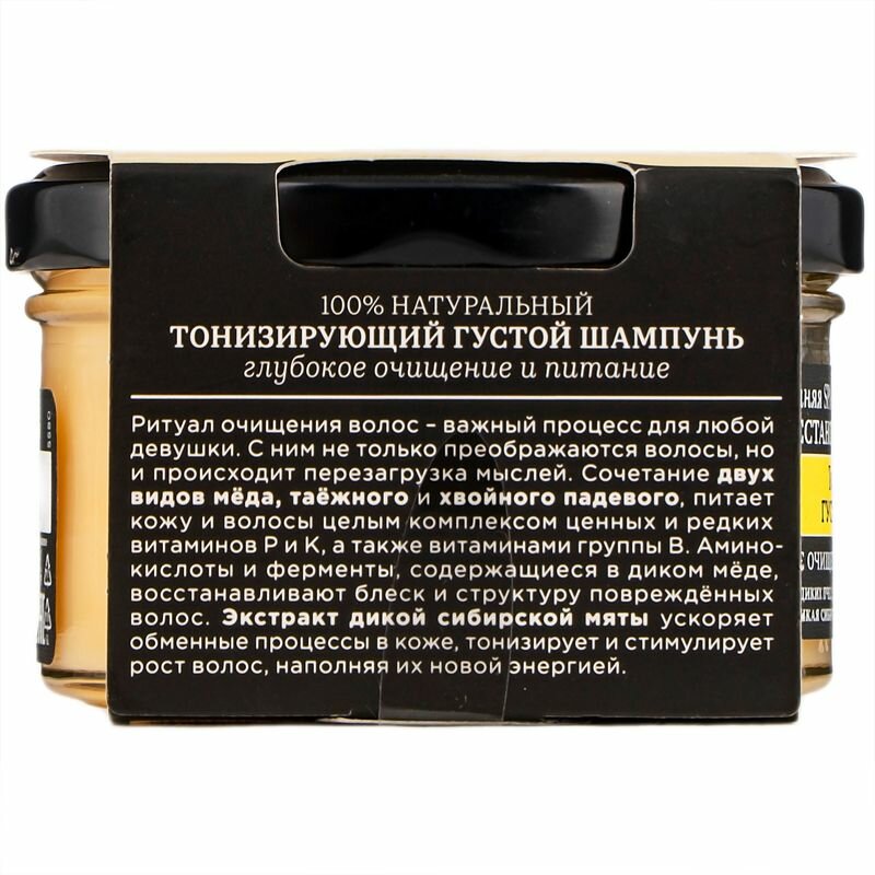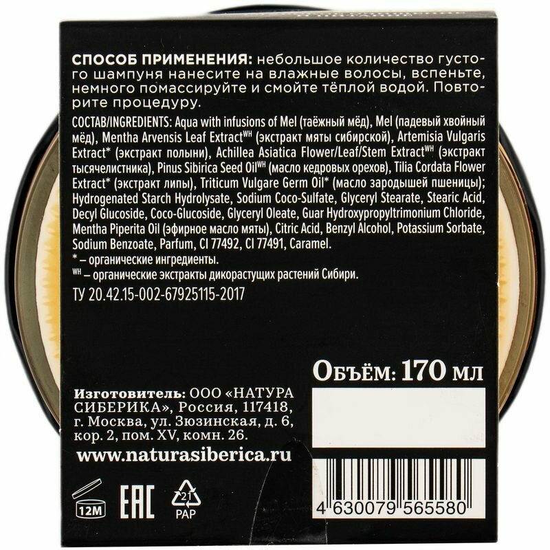 | Состав | Aqua with infusions of Mel (таёжный мёд), Mel (падевый хвойный мёд), Mentha Arvensis Leaf ExtractWH (экстракт мяты сибирской), Artemisia Vulgaris Extract* (экстракт полыни), Achillea Asiatica Flower/Leaf/Stem ExtractWH (экстракт тысячелистника), Pinus Sibirica Seed OilWH (масло кедровых орехов), Tilia Cordata Flower Extract* (экстракт липы), Triticum Vulgare Germ Oil* (масло зародышей пшеницы); Hydrogenated Starch Hydrolysate, Sodium Coco-Sulfate, Glyceryl Stearate, Stearic Acid, Decyl Glucoside, Coco-Glucoside, Glyceryl Oleate, Guar Hydroxypropyltrimonium Chloride, Mentha Piperita Oil (эфирное масло мяты), Citric Acid, Benzyl Alcohol, Potassium Sorbate, Sodium Benzoate, Parfum, CI 77492, CI 77491, Caramel. * – органические ингредиенты. WH – органические экстракты и масла дикорастущих растений Сибири |