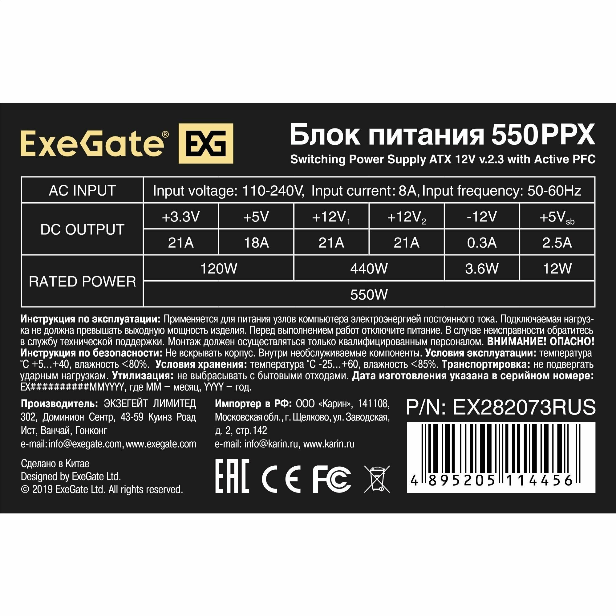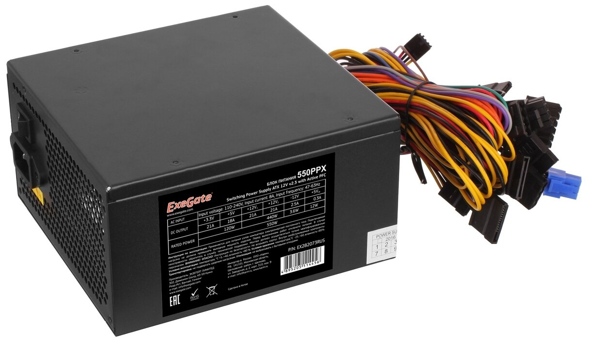 Блок питания ATX Exegate EX282073RUS 550W RTL black APFC 14cm 24p+(4+4)p PCI-E4*IDE5*SATA FDD 550PPX