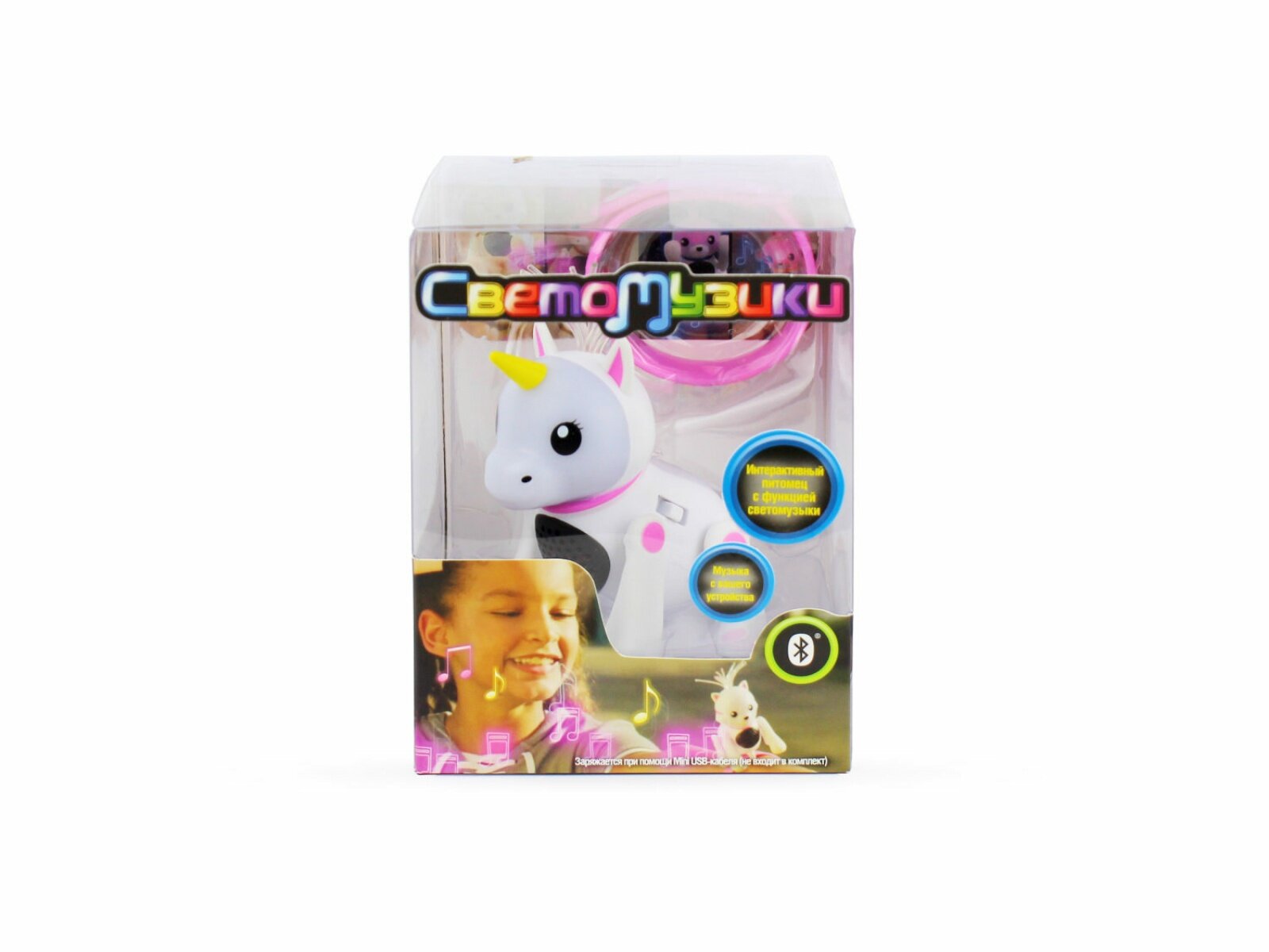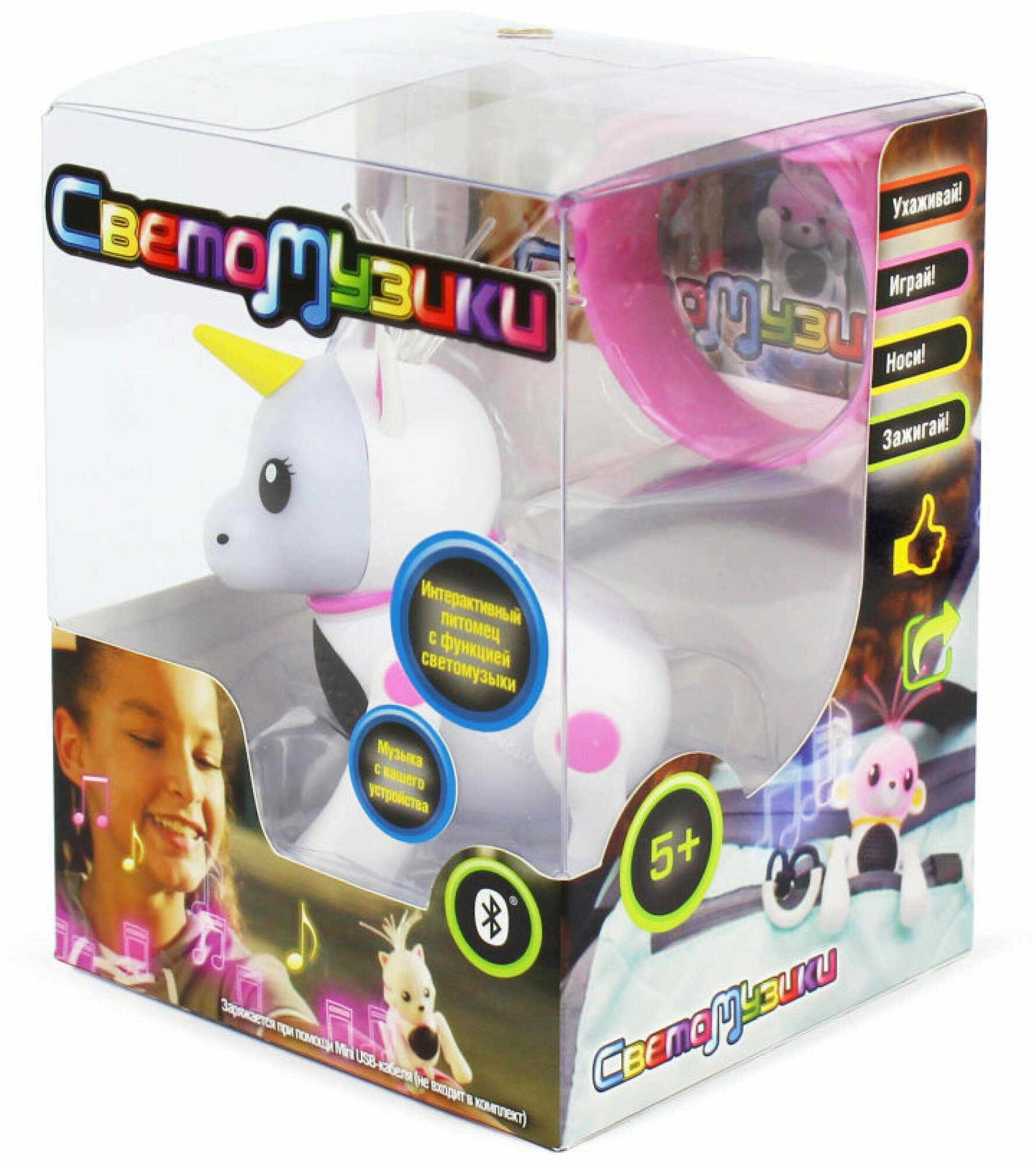 Светомузики – интерактивные и музыкальные питомцы, которых везде можно взять с собой! Единорог станет отличным другом для любой девочки. Он всегда в центре внимания, очень музыкальный и яркий. Щенок реагирует на твои прикосновения и звуки. Разные цвета подсветки указывают на разное настроение питомца, он издаёт разные звуки. Мордочка пульсирует под музыку, которая передаётся по BLUETOOTH с любого мобильного устройства, а хвостик и пучок волос светятся музыке в такт. В комплект входит удобный ремешок, благодаря которому Светомузика можно надевать на руку, крепить к рюкзаку. В игрушку встроена колонка.Зряжается от mini-USB кабеля 5V (входит в комплект). Упаковка - ПВХ-коробочка.
