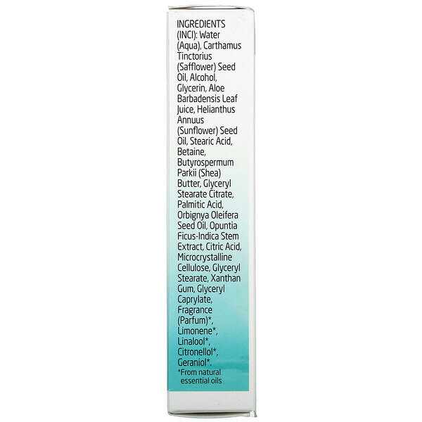 | Состав | Water (Aqua), Carthamus Tinctorius (Safflower) Seed Oil, Alcohol, Glycerin, Aloe Barbadensis Leaf Juice, Helianthus Annuus (Sunflower) Seed Oil, Stearic Acid, Betaine, Butyrospermum Parkii (Shea) Butter, Glyceryl Stearate Citrate, Palmitic Acid, Orbignya Oleifera Seed Oil, Opuntia Ficus-Indica Stem Extract, Citric Acid, Microcrystalline Cellulose, Glyceryl Stearate, Xanthan Gum, Glyceryl Caprylate, Fragrance (Parfum), Limonene, Linalool, Citronellol, Geraniol |