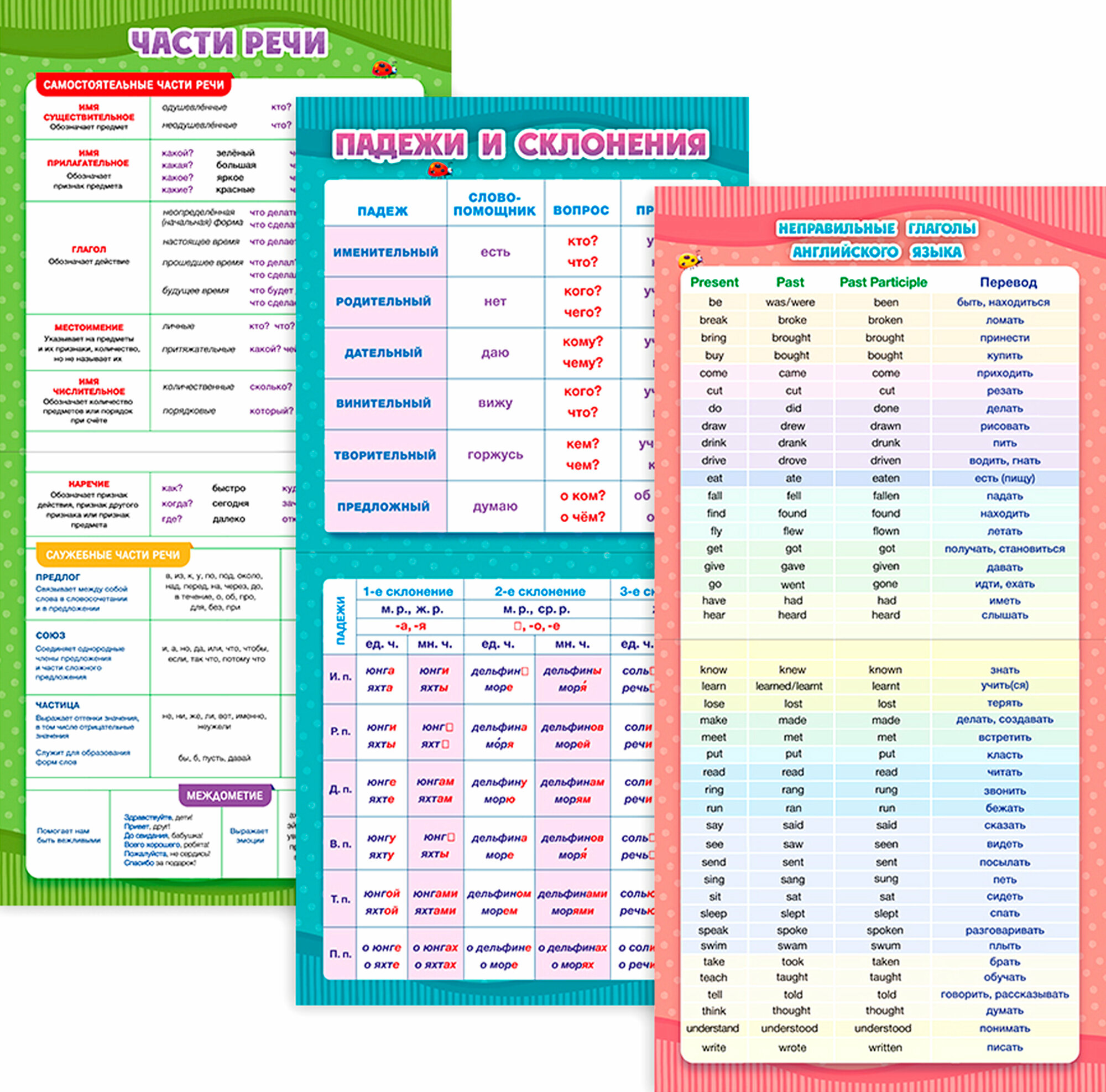 Плакаты: состав числа, арифметические действия, доли и дроби, таблица умножения, меры величин, состав слова, части речи, падежи и склонения, неправильные глаголы английского языка.
