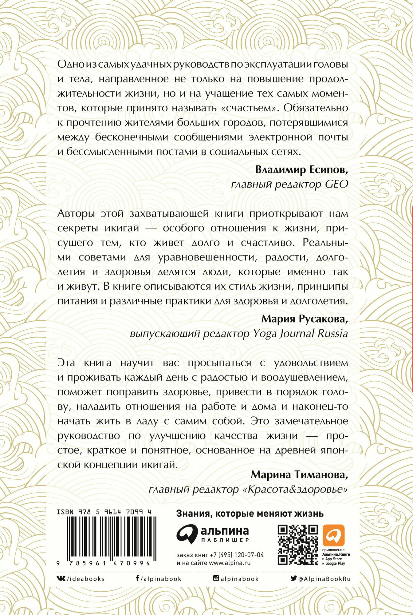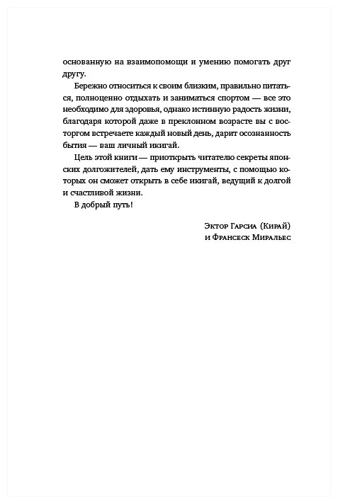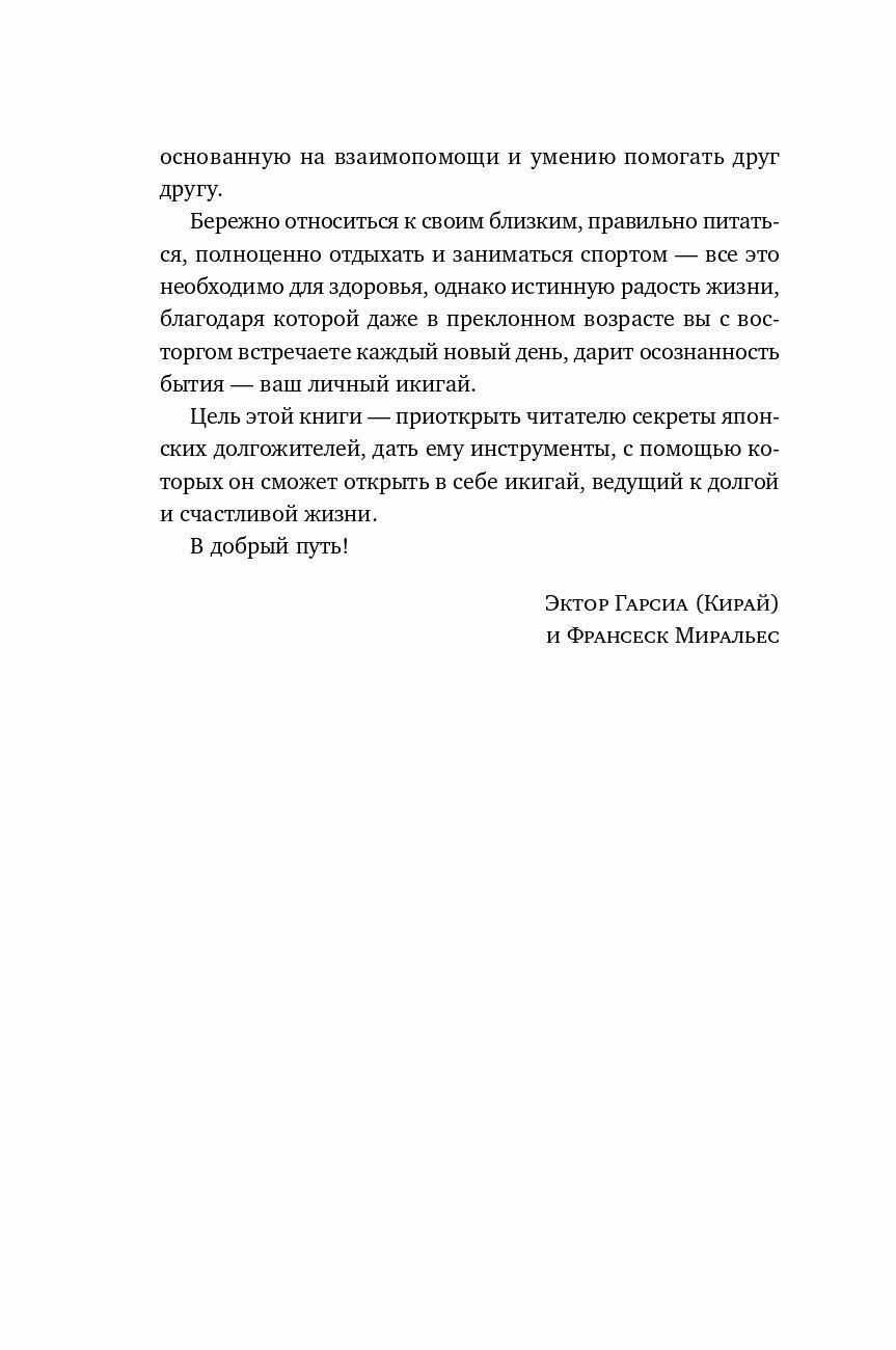 Икигай — одно из главных понятий японской философии здоровья и долголетия. Оно означает смысл жизни и предназначение человека в ней. Для одних икигай — это семья, для других любимая работа или вдохновляющее хобби. Если человеку удается обрести свой икигай и следовать ему, его жизнь наполняется радостью, энергией и гармонией, а ее качество и продолжительность увеличиваются. В этом лично убедились исследователь Эктор Гарсия (Кирай), проживший в Японии 12 лет и полюбивший эту страну всей душой, и популярный испанский писатель и путешественник Франсеск Миральес. Они отправились в деревушку Охими на острове Окинава, чтобы узнать, почему там так много долгожителей? Ответ оказался простым: у каждого из них был икигай. Авторы книги делятся с читателями секретами его обретения.