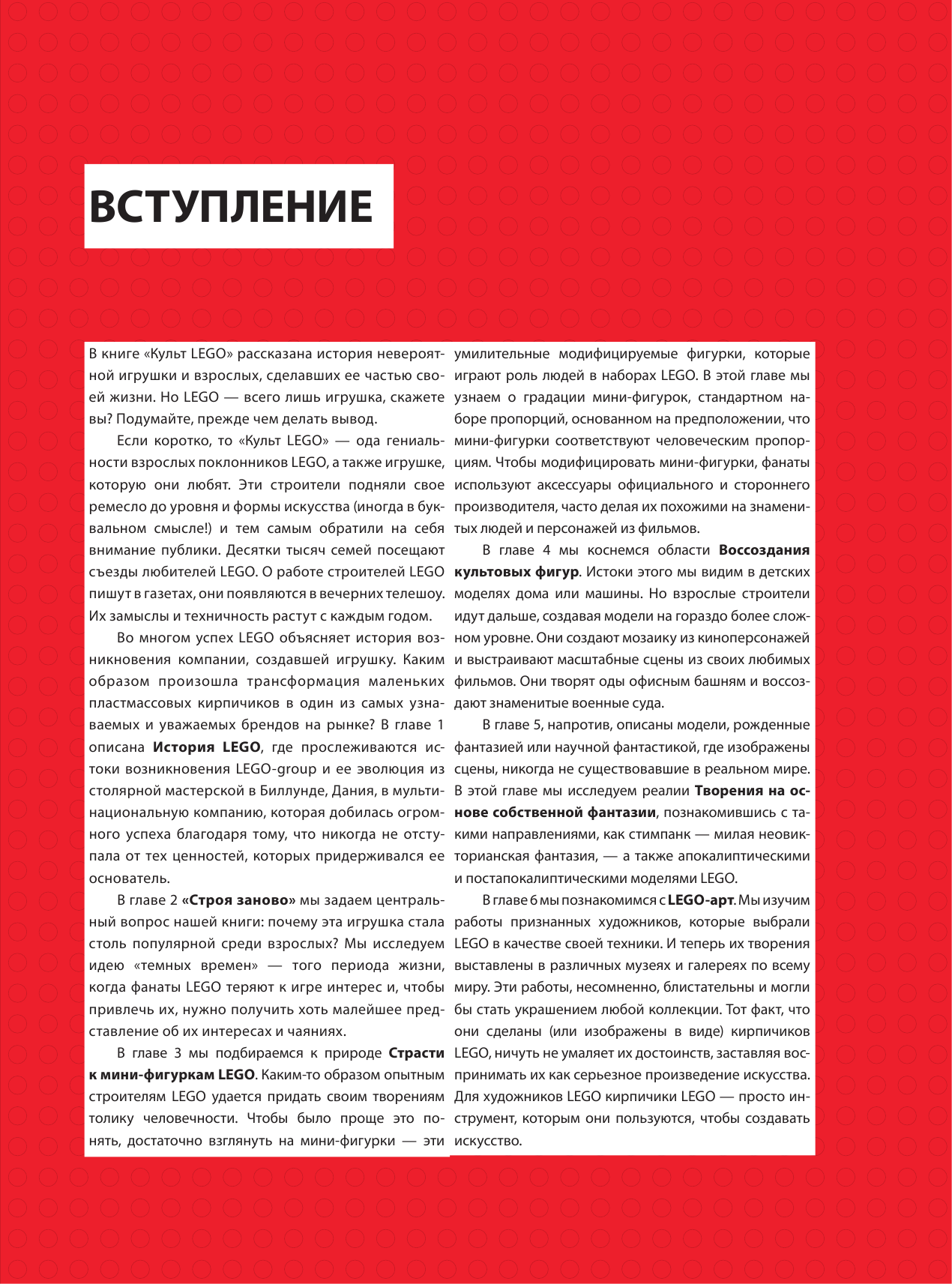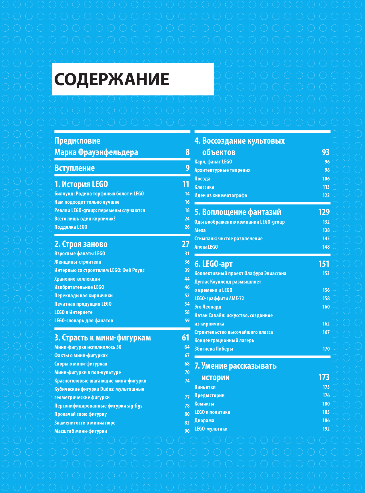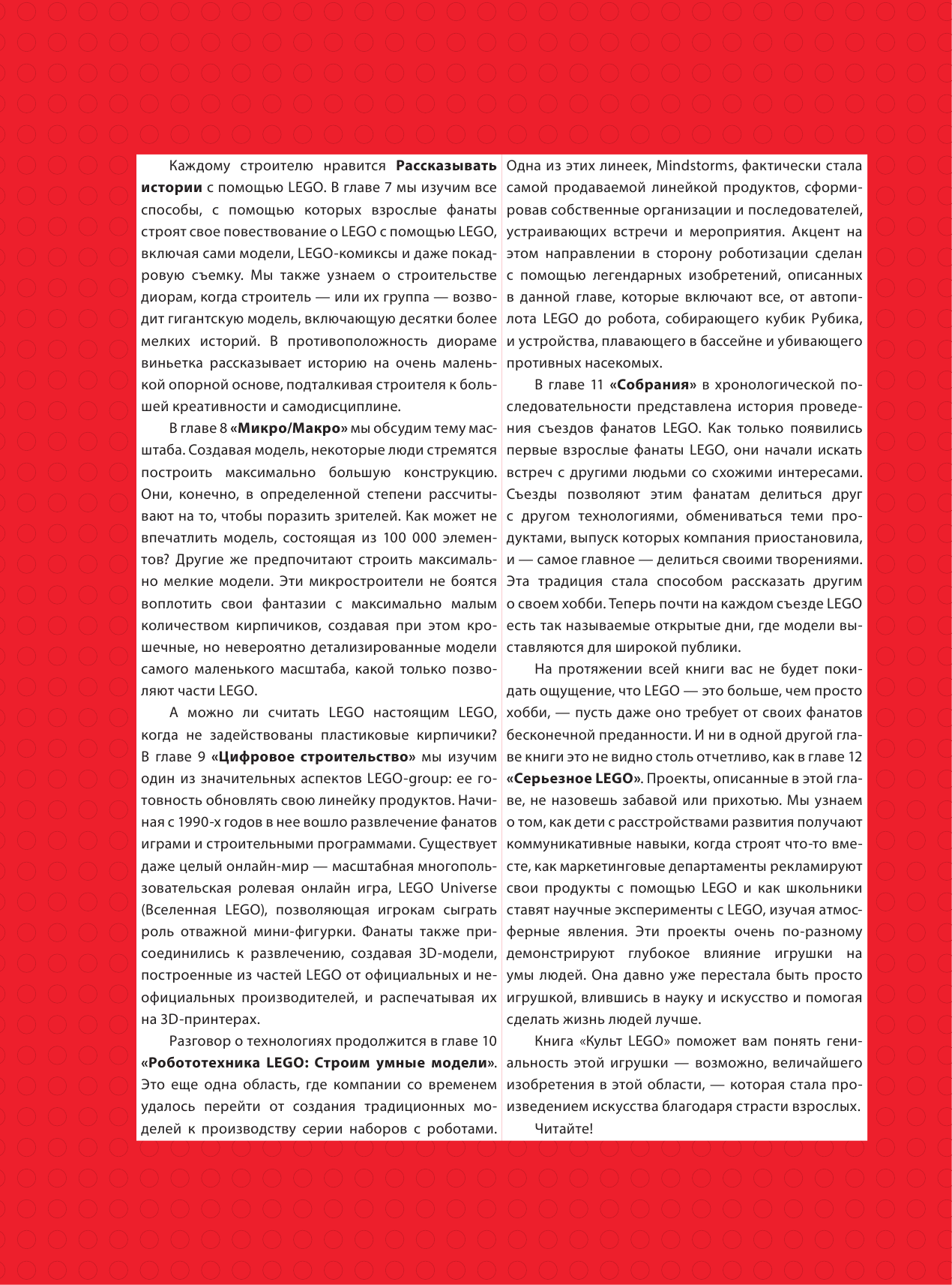Это история невероятного сообщества любителей LEGO. Страница за страницей вы будете поражаться фантазии и мастерству лучших LEGO-строителей, создающих настоящие шедевры: от гигантских полноразмерных моделей, вроде стегозавра или боевых кораблей времен Второй мировой войны, до крохотных архитектурных чудес. Вы узнаете о серьезной стороне LEGO — о том, как цветные детальки используют в создании прототипов, в терапии и даже в качестве формы политического высказывания.