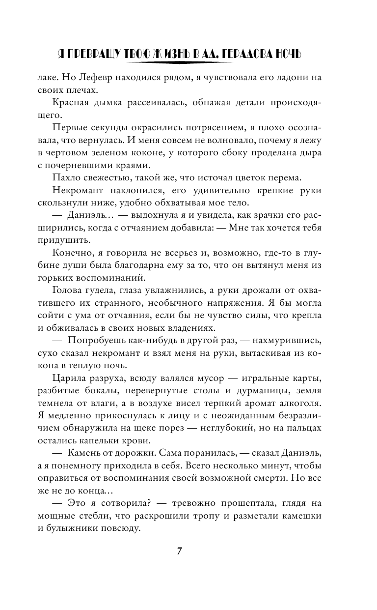 Продолжение и, видимо, окончание книги "Я превращу твою жизнь в ад" отличается от первой книги, прежде всего объемом. На вид книга такая же, как и первая, то текста поместилось гораздо больше за счет очень мелкого шрифта. Вторая книга драматичнее. События сменяют друг друга с кинематографической быстротой. Имеется легкая детективная линия. И мы наконец-то получаем ответы на многочисленные вопросы, которые остались после прочтения первой книги. Конечно, автор подарила своей ГГ-не немало плюшек и даже благословение богини... Но все же Эмма не превратилась окончательно в Мэри Сью, что радует. Интересны и второстепенные герои - Дарла, Ридж и некоторые другие. На мой взгляд, недоработана линия чувств Горидаса к ГГ-не. Не слишком понятно, зачем богиня заменила одну девушку на другую - из-за более боевого характера или по другой причине? Ну и еще ряд вопросов остались... Но в целом читабельно. Герои (главные, конечно) интересны.