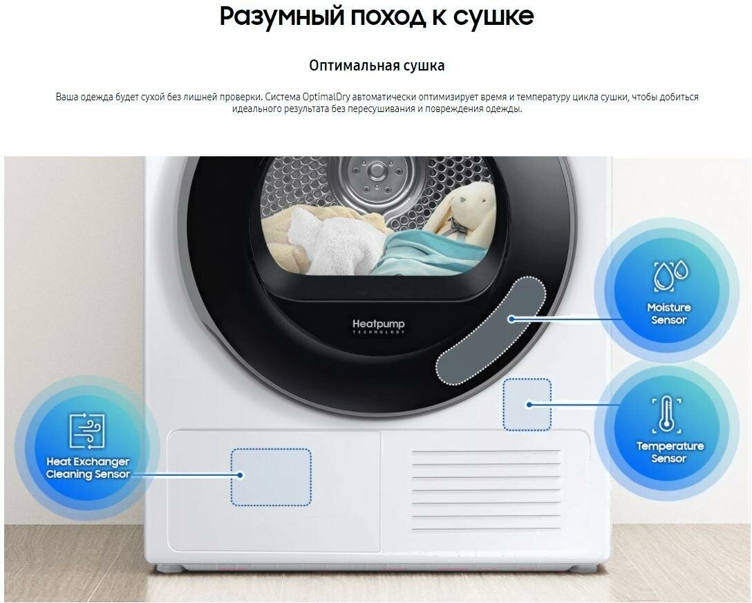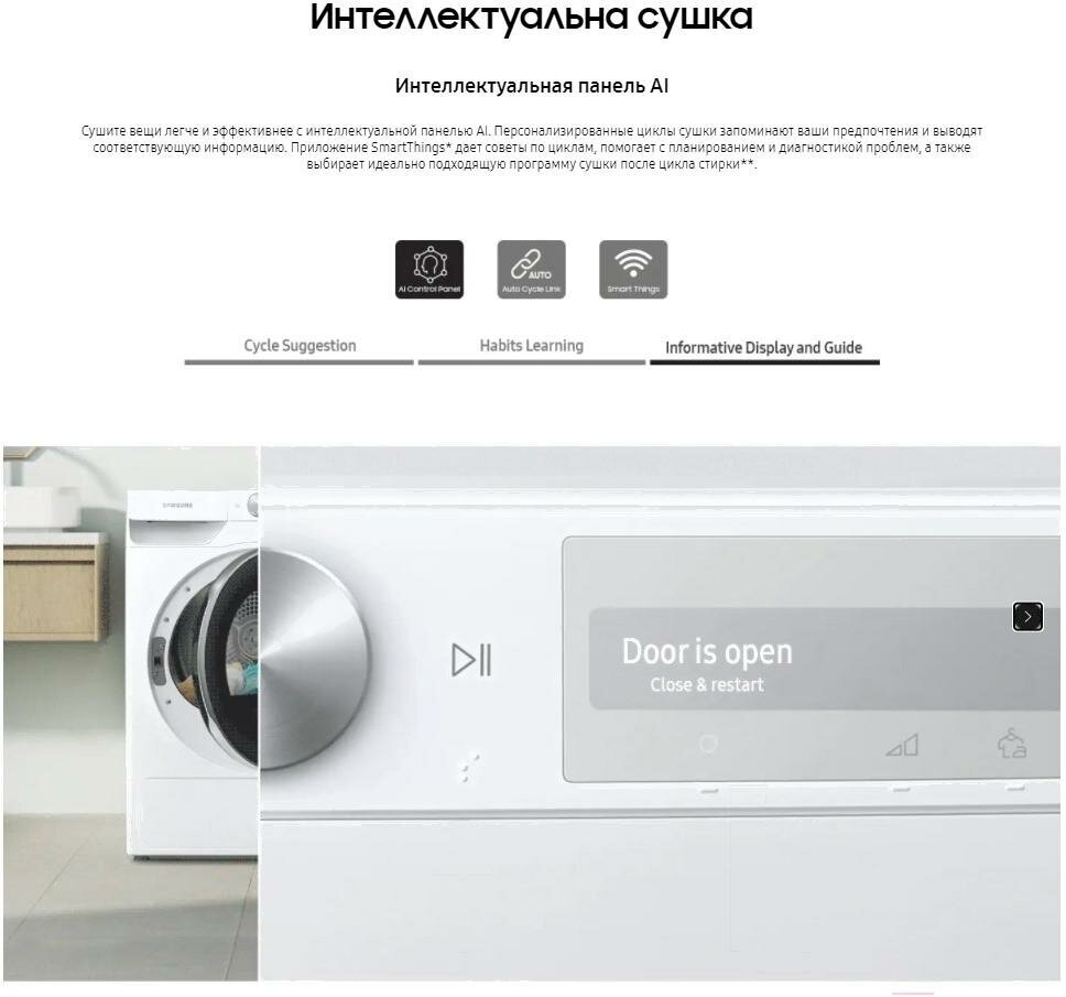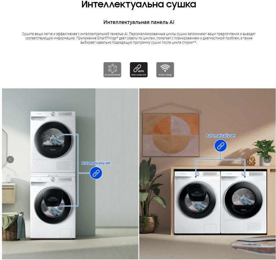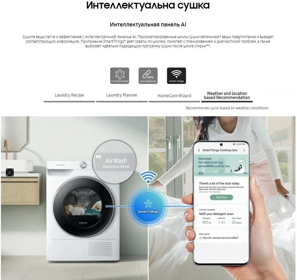 Сушите вещи легче и эффективнее с интеллектуальной панелью AI. Персонализированные циклы сушки запоминают ваши предпочтения и выводят соответствующую информацию. Приложение SmartThings дает советы по циклам, помогает с планированием и диагностикой проблем, а также выбирает идеально подходящую программу сушки после цикла стирки.