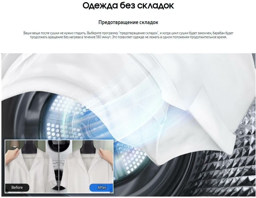 Ваши вещи после сушки не нужно гладить. Выберите программу предотвращение складок, и когда цикл сушки будет закончен, барабан будет продолжать вращение без нагрева в течение 180 минут. Это позволяет одежде не лежать в одном положении продолжительное время.