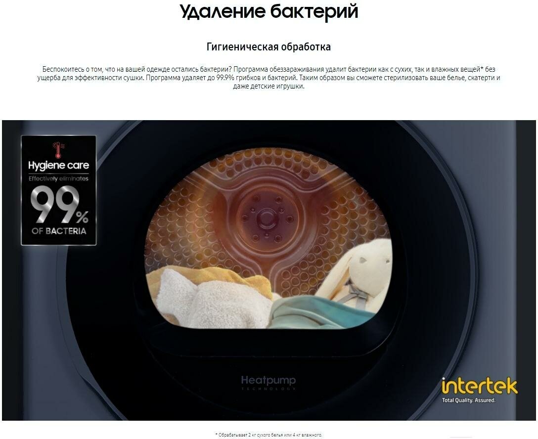 Беспокоитесь о том, что на вашей одежде остались бактерии? Программа обеззараживания удалит бактерии как с сухих, так и влажных вещей без ущерба для эффективности сушки. Программа удаляет до 99.9% грибков и бактерий. Таким образом вы сможете стерилизовать ваше белье, скатерти и даже детские игрушки.