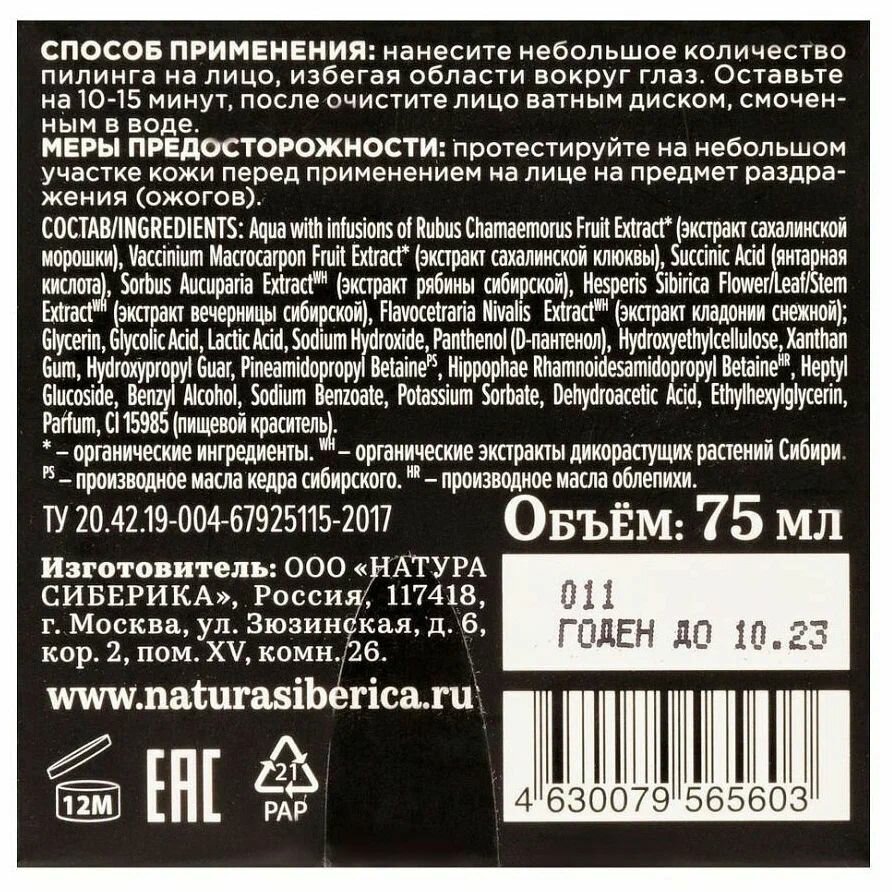 | Состав | aqua with infusions of rubus chamaemorus fruit extract (экстракт морошки), vaccinium macrocarpon fruit extract (экстракт клюквы), succinic acid (янтарная кислота), sorbus aucuparia extractwh (экстракт рябины сибирской), hesperis sibirica flower/leaf/stem extractwh (экстракт вечерницы сибирской), flavocetraria nivalis extractwh(экстракт кладонии снежной); glycerin, glycolic acid, lactic acid, sodium hydroxide, panthenol (d-пантенол), hydroxyethylcellulose, xanthan gum, hydroxypropyl guar, pineamidopropyl betaineps, hippophae rhamnoidesamidopropyl betainehr , heptyl glucoside, benzyl alcohol, sodium benzoate, potassium sorbate, dehydroacetic acid, ethylhexylglycerin, parfum, ci 15985 (пищевой краситель) |