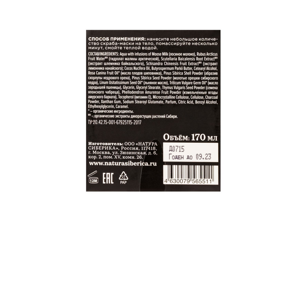 | Состав | лосиное молоко, экстракт ягод амурского бархата, Helianthus Annuus Seed Oil, Cetearyl Alcohol, абразив скорлупы кедрового ореха, молотые орешки сибирского кедра, Glycerin, Glyceryl Stearate, семеня японского чабреца, витамин Е, Xanthan Gum, Sodium Stearoyl Glutamate, Parfum, Citric Acid, Benzyl Alcohol, Ethylhexylglycerin, Caramel.Органические ингредиенты |