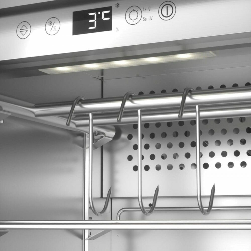 Шкаф для вызревания мяса Caso (Касо) выпускается в прочном корпусе из нержавеющей стали и оснащен понятным управлением сенсорного типа с цифровым дисплеем. Внутри камеры установлено 4 полки и штанга для крючков. Для защиты от бактерий в камере используется ультрафиолетовая лампа.