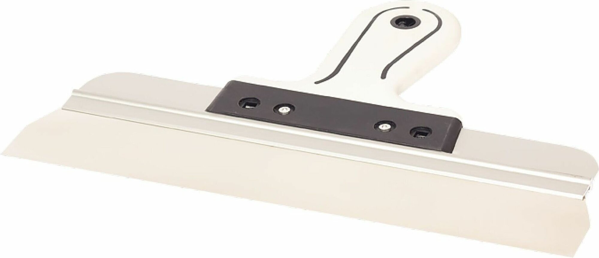 Изготовлен из нержавеющей стали, имеет алюминиевое ребро жесткости - которое предотвращает искривление полотна, двухкомпонентную эргономичную ручку обеспечивающую надежный захват инструмента, благодаря чему снижается утомляемость мастера создавая дополнительный комфорт при работе.