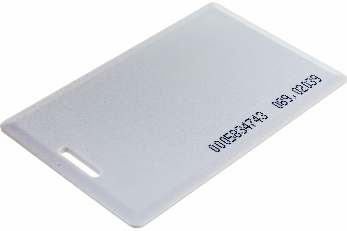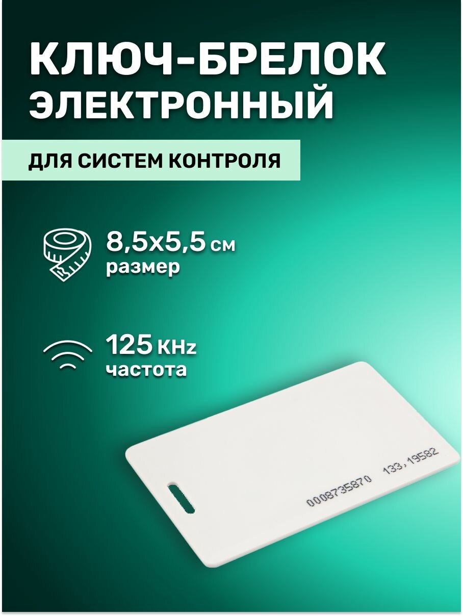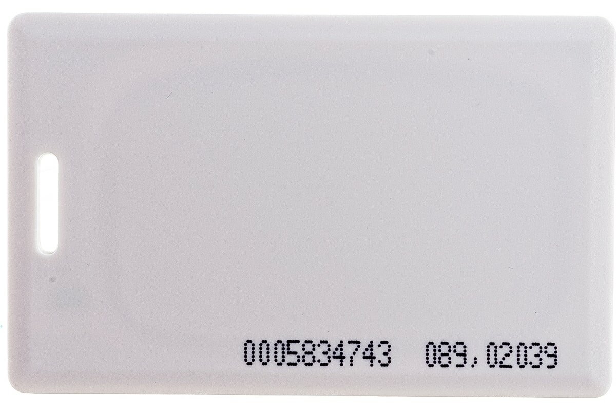Ключ электронный 125KHz формат EM Marin имеет размеры обычной кредитной карты.Бесконтактные карты используются в системах контроля доступа для идентификации личности. В карту занесен код. При поднесении к бесконтактному считывателю код с карты считывается и передается в контроллер. Преимуществом электронных пропусков является возможность использовать их не только в качестве бесконтактной идентификации личности, ключа для доступа в помещение, но и для организации контроля трудовой дисциплины и учета рабочего времени.