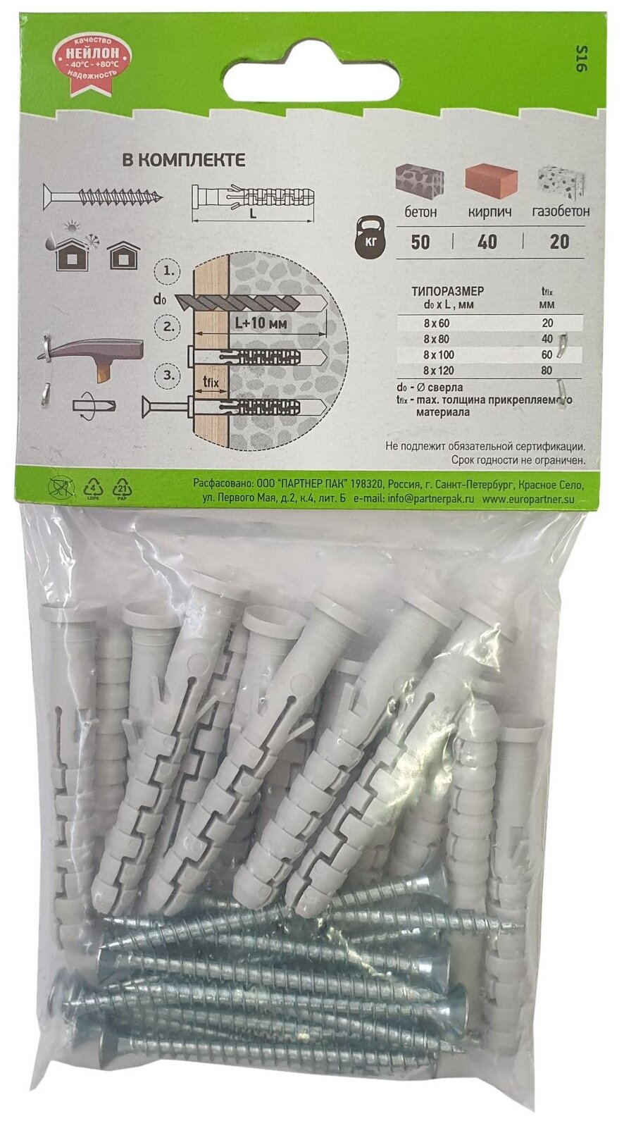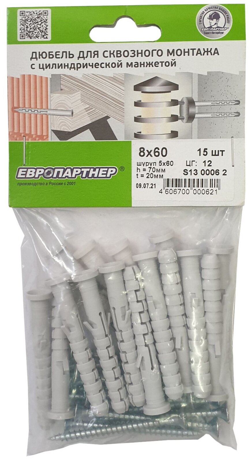 Дюбель универсальный распорный ЕВРОПАРТНЕР PNDS 8x60 мм с шурупом 15 шт
