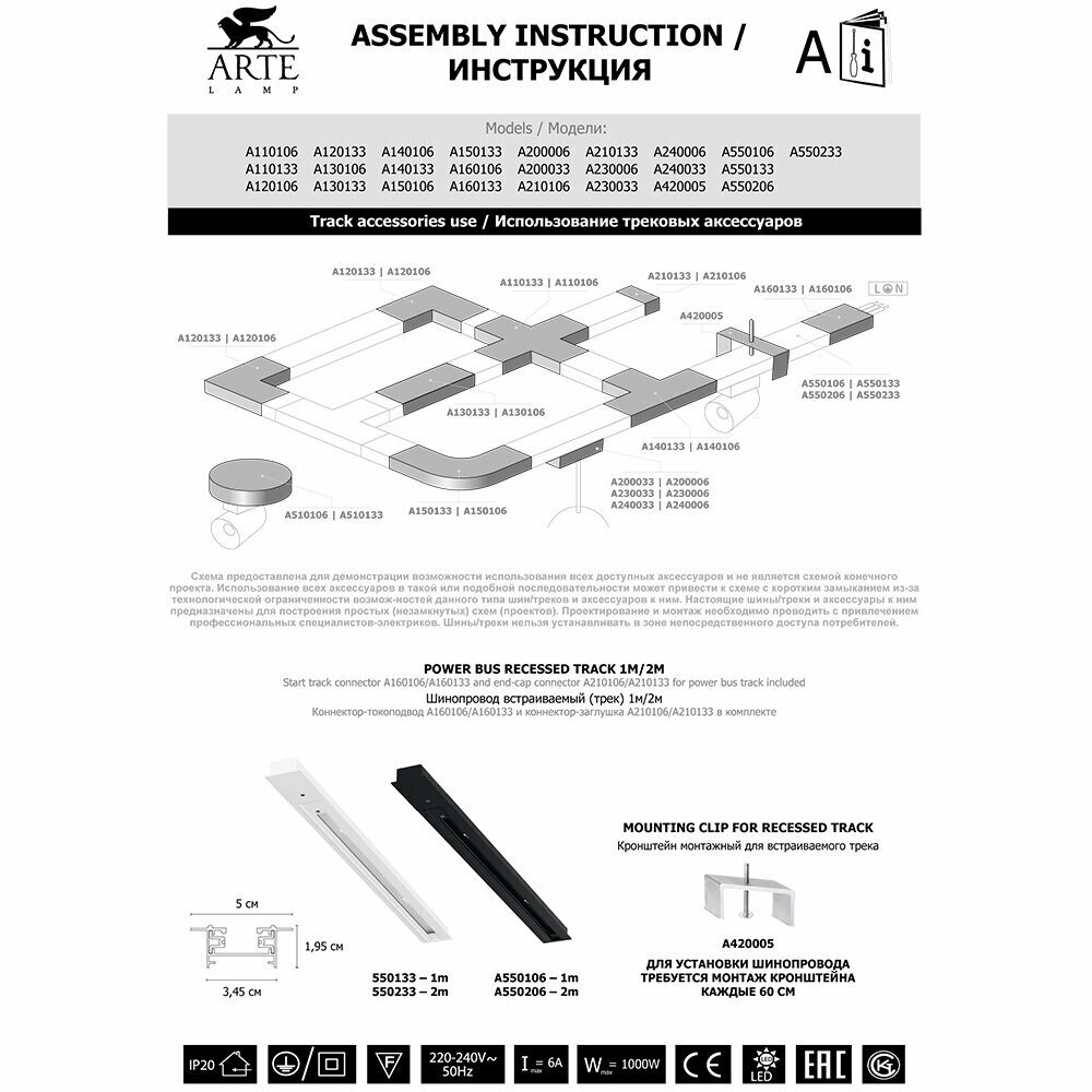 Шинопровод встраиваемый Arte Lamp TRACK ACCESSORIES 200 см белый