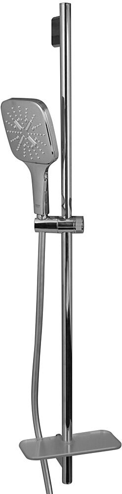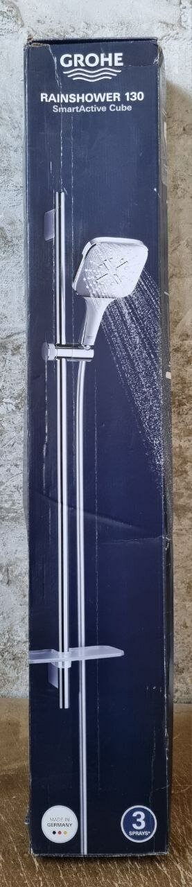 Душевой гарнитур Grohe Rainshower SmartActive 130 Cube 26586000.Прекрасно смотрится в интерьере современного стиля благодаря решительным очертаниям геометрической формы корпуса и профессиональным функциям.Характеристики:- Материал: латунь.- Цвет: хром.- Хромированное покрытие Grohe StarLight гарантирует длительную износостойкость без царапин с сияющей чистотой.- Технология Grohe DreamSpray равномерно распределяет поток воды через все форсунки при любом режиме струи.- Система термоизоляции водных протоков внутри ручного душа предотвращает нагревание его поверхности.- Форсунки оснащены системой SpeedClean с легкой очисткой от известковых отложений.- Удобная полочка EasyReach для аксессуаров и косметических средств проста в уходе.- Система быстрого монтажа Grohe QuickFix позволяет установить конструкцию за считанные минуты.- Ручной душ на три вида струи.- Душевая штанга высотой 90 см с регулируемым держателем.- Душевой шланг длиной 175 см с системой антискручивания TwistFree.- Подходит для проточных водонагревателей.- Минимальное давление 1,0 бар.- Стандарт подключения: G 1/2.В комплекте поставки: душ ручной (26550000), душевая штанга 900 мм, душевой шланг (28388000).