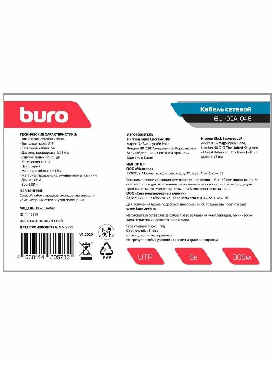 Сервис сравнения цен СкидкаГИД предлагает сравнить цены на товар «Кабель сетевой BURO BU-CCA-048 UTP cat.5E 305м 4 пары CCA одножильный (solid) серый»
