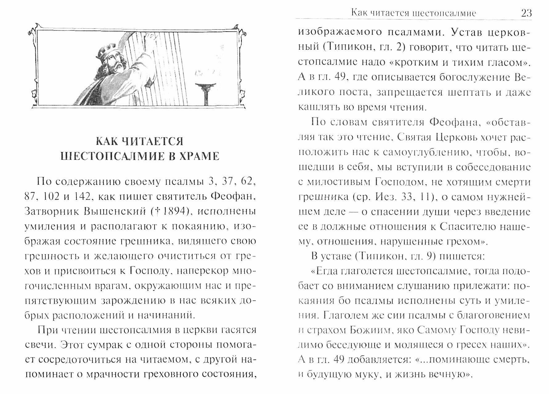В этой небольшой книжке рассказывается об одной из важнейших частей богослужения - о шестопсалмии. Приводятся тексты псалмов с параллельным переводом на русский язык П. А. Юнгерова и краткое толкование каждого стиха, почерпнутое из святых отцов.