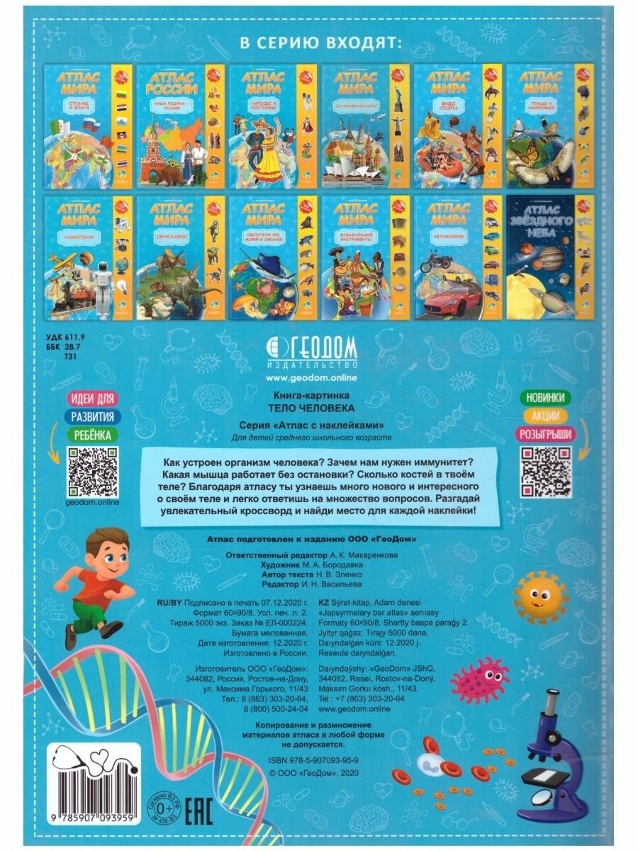 Как в доступной форме объяснить ребёнку устройство человеческого тела? Легко с нашим атласом "Тело человека". В нём простым и понятным ребёнку языком рассказывается о том, как устроен организм человека, как работает наш иммунитет, сколько костей в теле и ещё много всего интересного. Самые любознательные смогут найти на первой странице увлекательный кроссворд. Ну и конечно, куда же без ярких и интересных наклеек, место которых нужно разыскать в атласе.