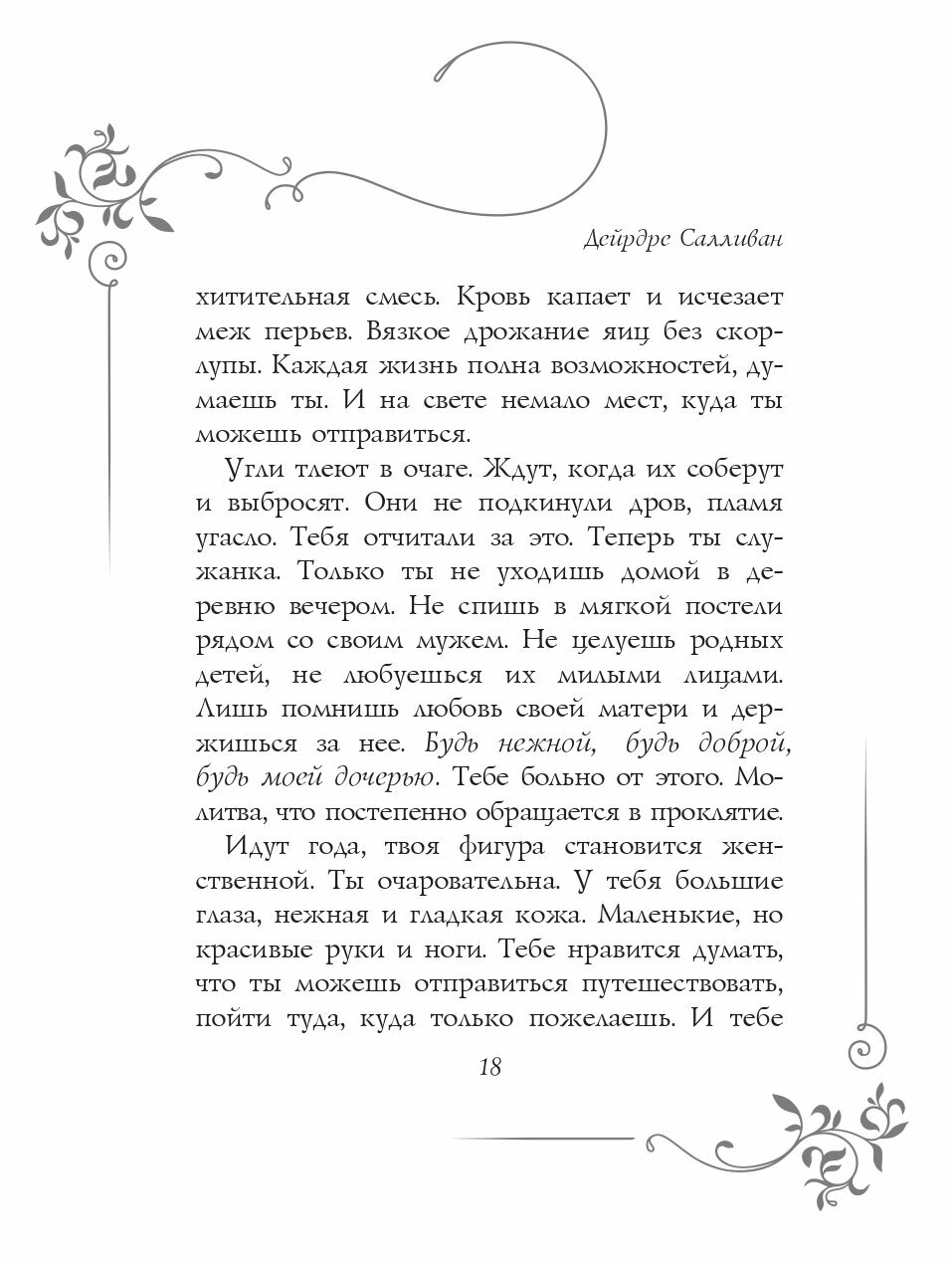 Дейрдре Салливан обладает по-настоящему магическим слогом. Она не пересказывает, а танцует по строкам давно знакомых нам сказок, с особой ритмикой и грацией. Перевести этот изысканный танец нелегко, но я старалась шагать за ней в ногу. Потому что вместе с тактом Дейрдре вложила в эти сказки всю свою душу, чувства и размышления.