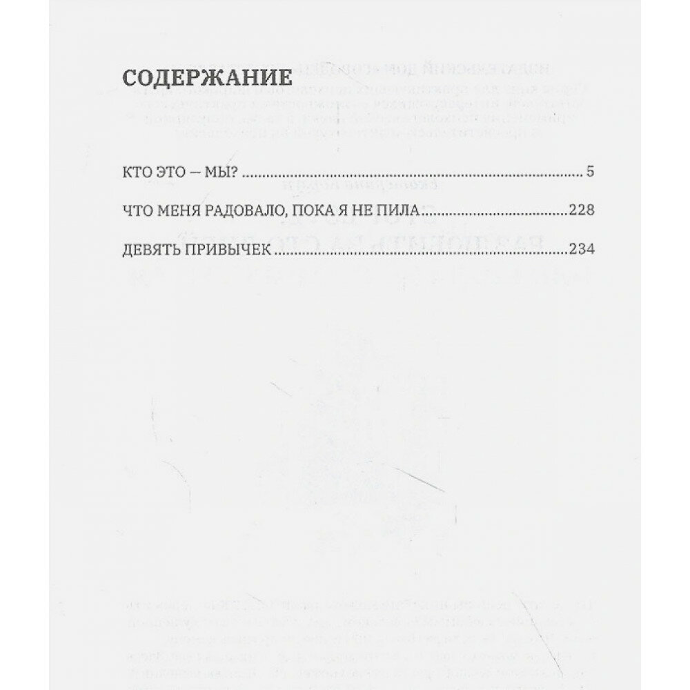 Несмотря на болезненную тему, эта книга получилась радостной, обнадеживающей и местами веселой. Она - о вас, обо мне и о том, куда может привести дорога, если просто попробовать новый маршрут. О поиске себя и пути к себе. А украшать его алкоголем или чем-то другим - всегда останется вашим выбором.