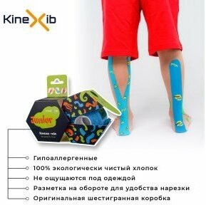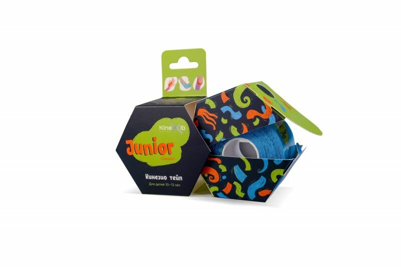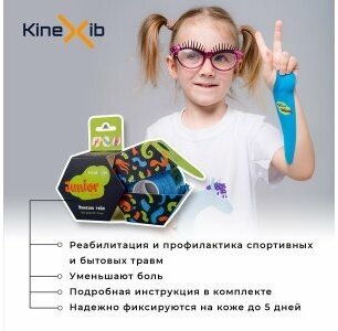 Kinexib Junior — это серия кинезио тейпов для детей с 10 лет. Предназначены для защиты и поддержки быстро растущего организма в спорте, уличных играх и путешествиях. Их особенность — гипоаллергенный состав и яркие цвета. Тейпы Kinexib Junior производятся по японской технологии и имеют медицинский сертификат соответствия.Состав:Лента из 100% хлопка, гипоаллергенный клей на акриловой основе.Без токсичных компонентов. Без неприятного запаха. Бумажная подложка легко отделяется от ленты. На обороте — разметка для удобства нарезки нужной длины. Тейп водостойкий, не нарушает привычную гигиену ребенка.Используется для: Профилактики спортивных и бытовых травм; реабилитации после ушибов мягких тканей, вывихов, травм колена, мениска, локтя; снятия отеков; уменьшения болевого синдрома; улучшения микроциркуляции крови и лимфотока; ускорения восстановления после растяжений связок, воспаления мышц и сухожилий; фиксации суставов, мышц при артритах, артрозах; усиления воздействия лечения в сочетании с массажем, лечебной физкультурой и т. д, включая бальнеолечение.Эффективно заменяет эластичный бинт. Легко накладывается и надежно фиксируется на коже, не ограничивая подвижность. Может использоваться для тейпирования любого участка тела: живота, колена, плеча, шеи, поясницы, голеностопа, запястья, спины, бедра, кисти, локтя, стопы, предплечья, ключицы, щиколотки, лопатки, лодыжки и т. д. Держится от 3 до 5 дней.Упаковка:Шестигранная коробка с узором в виде конфетти. Внутри — тейп (рулон) неонового голубого цвета с логотипом Kinexib. Принт отвлекает ребенка от травмы и служит способом выражения индивидуальности. Тейп поставляется с подробной иллюстрированной инструкцией.Рекомендации:Закругляйте концы тейпа — так они лучше фиксируются на коже; после наложения кинезио тейпа не забывайте прогладить его руками — от тепла рук активизируется адгезивный слой тейпа; больше схем тейпирования на сайте производителя.