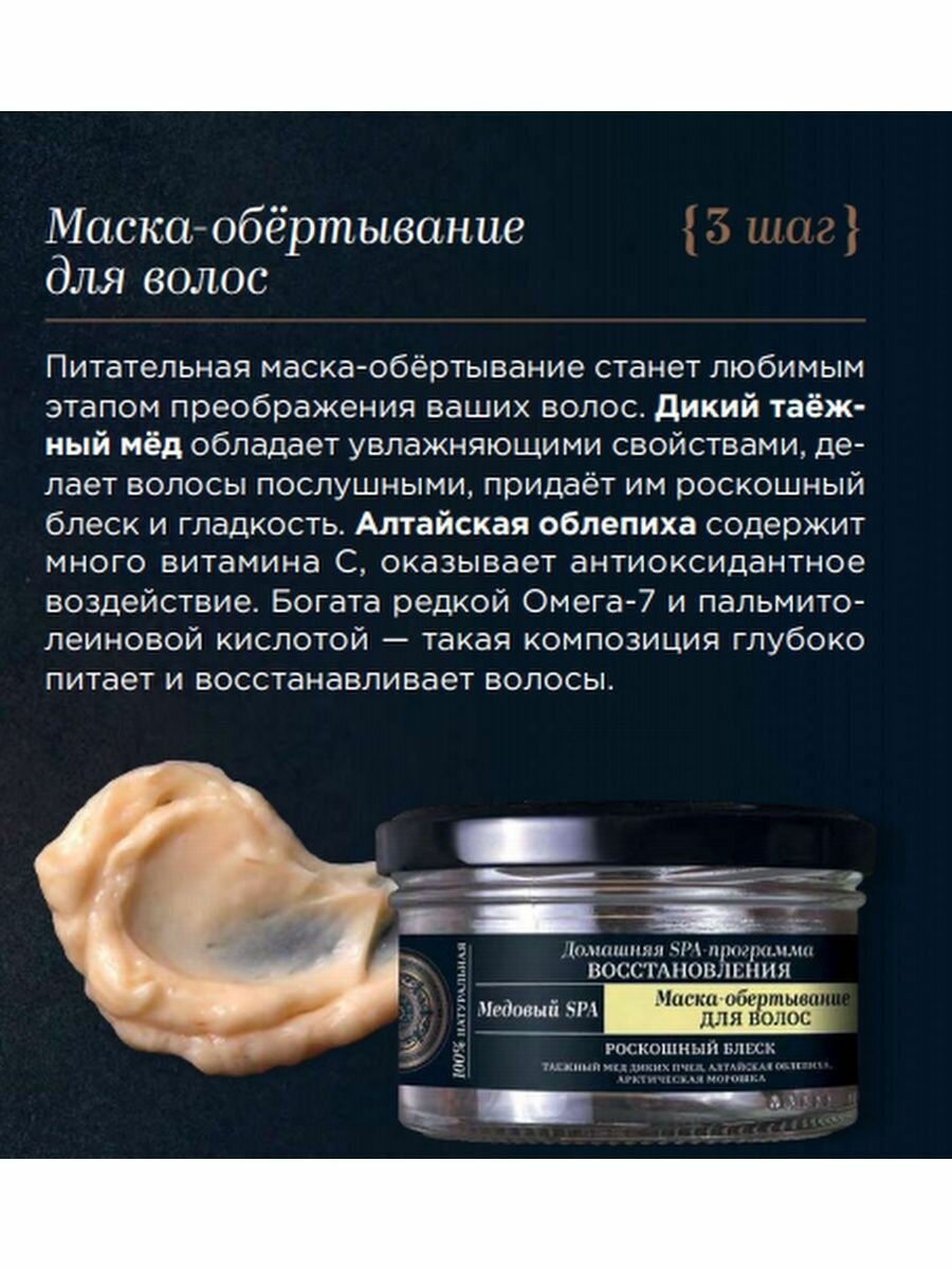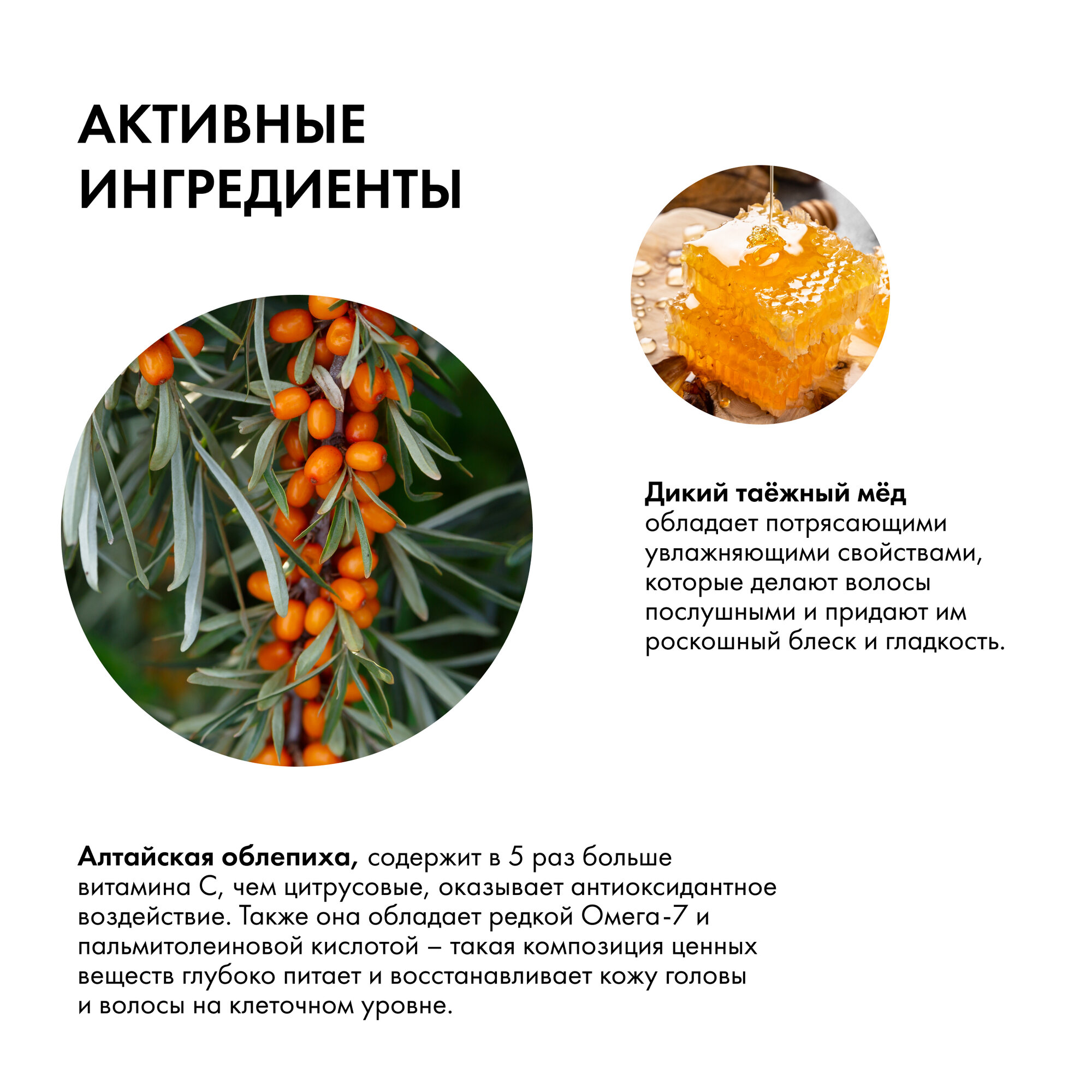 Погрузиться в истинное удовольствие с помощью сибирской SPA программы красоты — отвлечься от ежедневной суеты и стресса, восстановиться и наполниться жизненной энергией. Дикий сибирский мед, собранный коренным народом-чулымцами — настоящее сокровище для ваших волос. Он способен вернуть здоровый вид, наполнить волосы силой, энергией и красотой, делая их мягкими и шелковистыми. Даже самые повреждённые волосы перестают путаться и вновь выглядят ухоженно, излучая роскошный блеск. Питательная маска-обёртывание станет завершающим и любимым этапом преображения ваших волос. Дикий таёжный мёд обладает потрясающими увлажняющими свойствами, которые делают волосы послушными и придают им роскошный блеск и гладкость. Алтайская облепиха, содержит в 5 раз больше витамина С, чем цитрусовые, оказывает антиоксидантное воздействие. Также она обладает редкой Омега-7 и пальмитолеиновой кислотой – такая композиция ценных веществ глубоко питает и восстанавливает кожу головы и волосы на клеточном уровне.