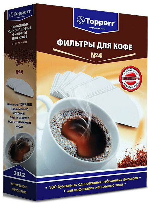 | Описание | Бумажные одноразовые фильтры для кофе Topperr 3014 изготовлены из специальной микропористой фильтровальной бумаги. Для изготовления фильтров для кофе используется бесклеевая технология. Фильтры предназначены для кофеварок капельного типа. |