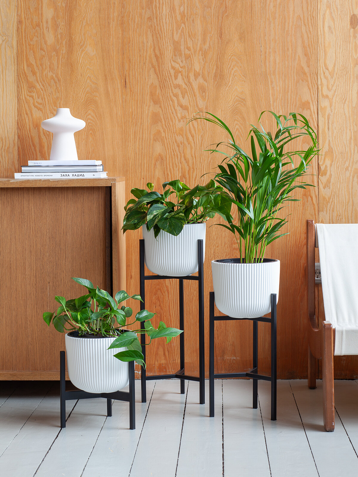 Неразборная конструкция на трёх ножках. Возможность двустороннего использования (глубина 9 и 13 см). Минималистичный дизайн. Пластиковые заглушки на ножках. Подходят под разные типы горшков и кашпо (D от 22 до 26 см).