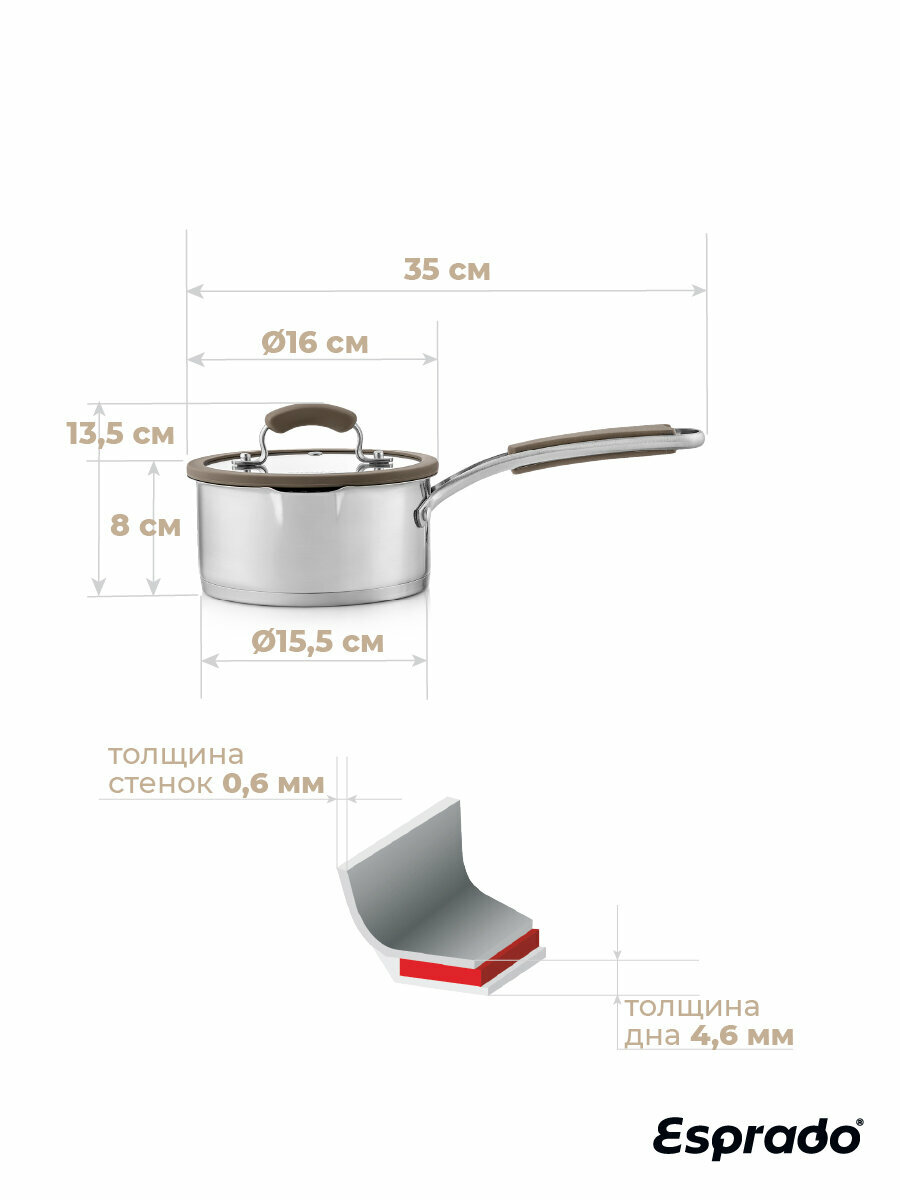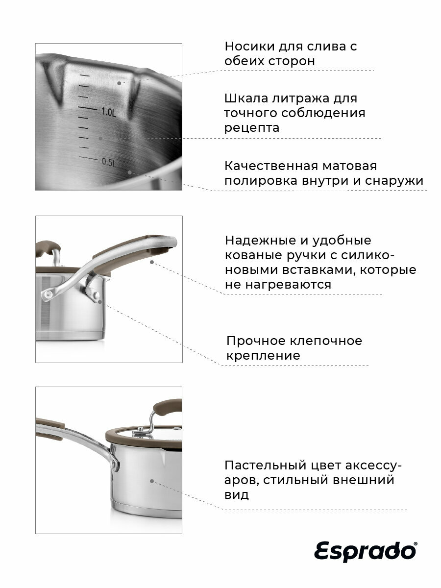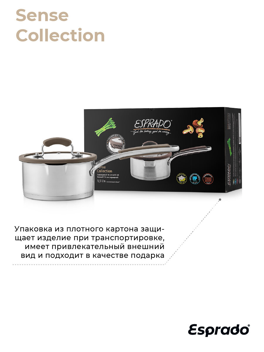 Ковш с крышкой ESPRADO Sense — модель премиум-класса, которая будет верно служить вам долгие годы. Его корпус выполнен из пищевой нержавеющей стали марки 18/10 Steelagen с матовой полировкой внутри и снаружи. Трехслойное дно толщиной 4,6 мм равномерно проводит тепло и долго поддерживает температуру содержимого, не давая ему остыть. Для удобства приготовления на внутренней поверхности ковша нанесены отметки литража. Ручка с надежным клепочным креплением Try-ply bottom оснащена нескользящими силиконовыми накладками. Крышка, корпус и дно изделия украшены стильным фирменным логотипом.