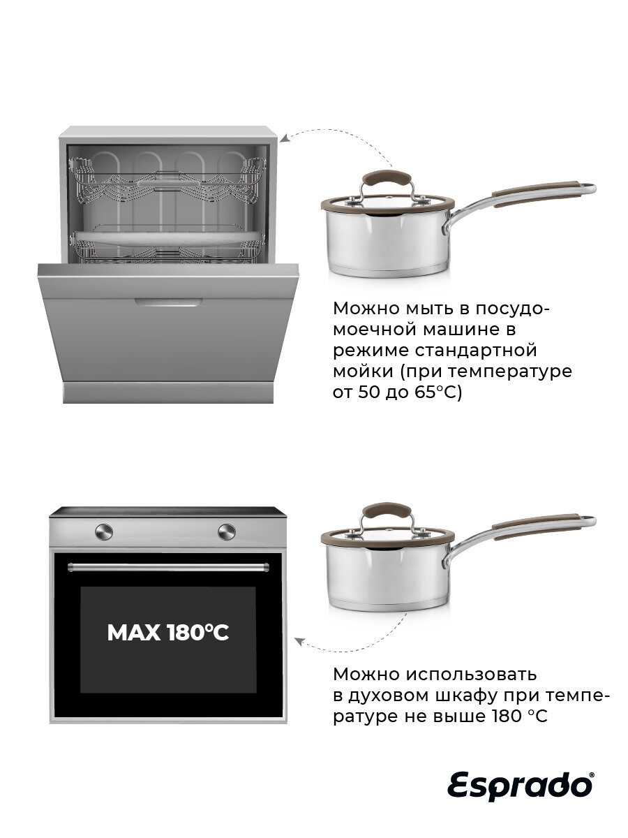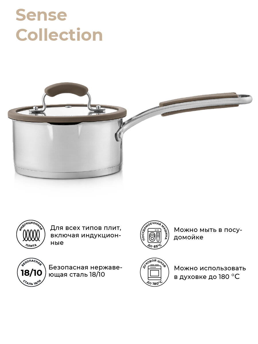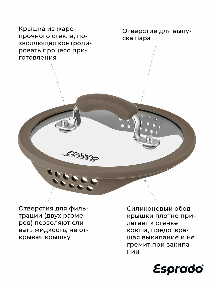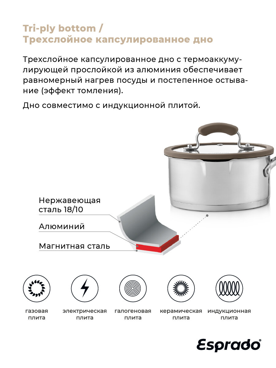 Ковш с крышкой ESPRADO Sense — модель премиум-класса, которая будет верно служить вам долгие годы. Его корпус выполнен из пищевой нержавеющей стали марки 18/10 Steelagen с матовой полировкой внутри и снаружи. Трехслойное дно толщиной 4,6 мм равномерно проводит тепло и долго поддерживает температуру содержимого, не давая ему остыть. Для удобства приготовления на внутренней поверхности ковша нанесены отметки литража. Ручка с надежным клепочным креплением Try-ply bottom оснащена нескользящими силиконовыми накладками. Крышка, корпус и дно изделия украшены стильным фирменным логотипом.